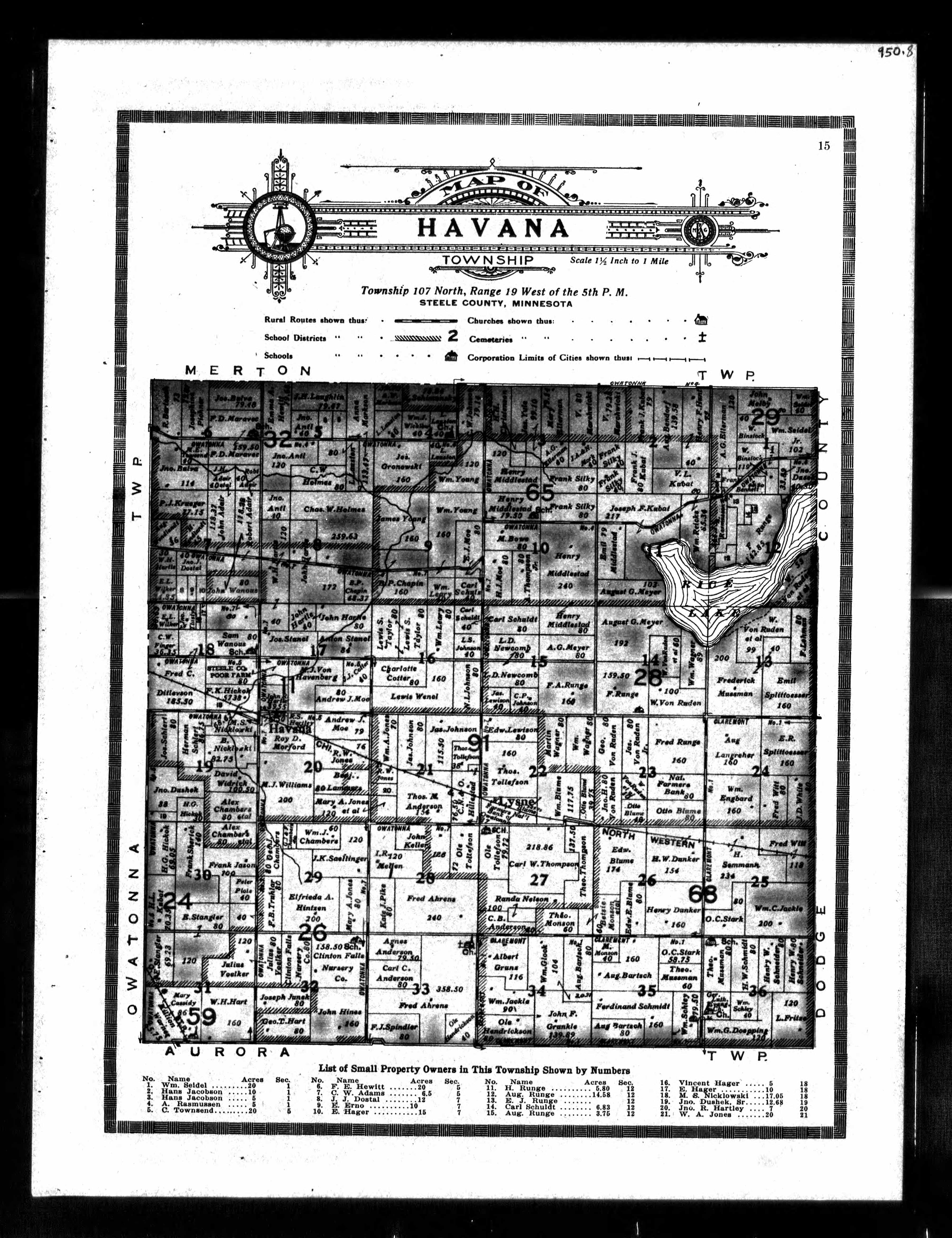 Ancestry.com Operations, Inc., U.S. Indexed County Land Ownership Maps, 1860-1918, Township 107N19W of the 5th P.M., Havana, Steele, MN, L Fritze; Database and images, Ancestry.com LLC, Ancestry.com : 2010 (http://www.Ancestry.com/ : accessed 08/02/2015); citing Various publishers of County Land Ownership Atlases, microfilm, Library of Congress, Washington, DC, G&M_77, roll 77 [Surety: 3]. |