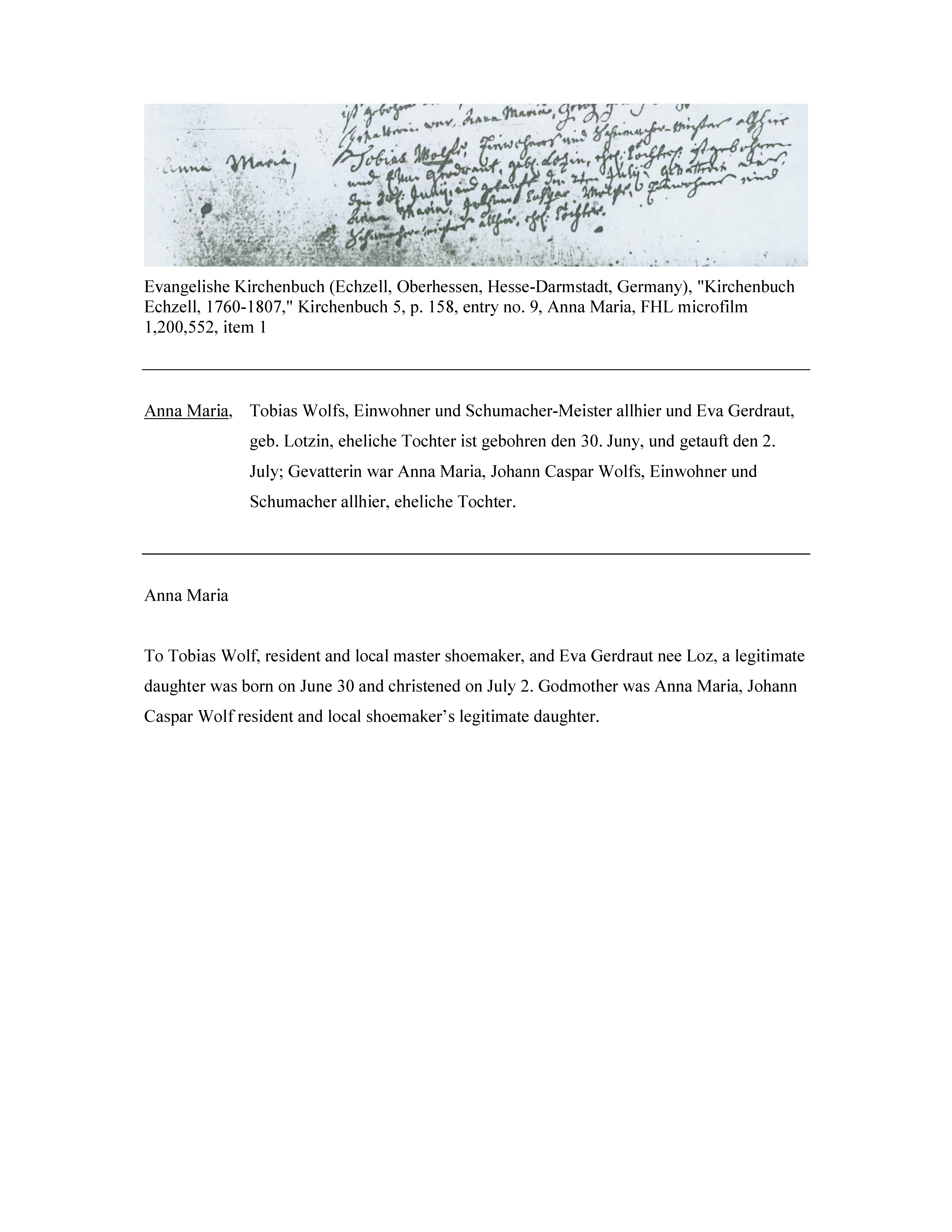 Evangelische Kirchenbuchen, Echzell, Oberhessen, Hesse-Darmstadt, Germany, Taufen-Tote-Hieraten-Konfirmationen, "Kirchenbuch Echzell, 1760-1807," Kirchenbuch 5, page 158, no. 9, Anna Maria; citing FHL microfilm 1,200,552, item 1 [Surety: 3]. |
