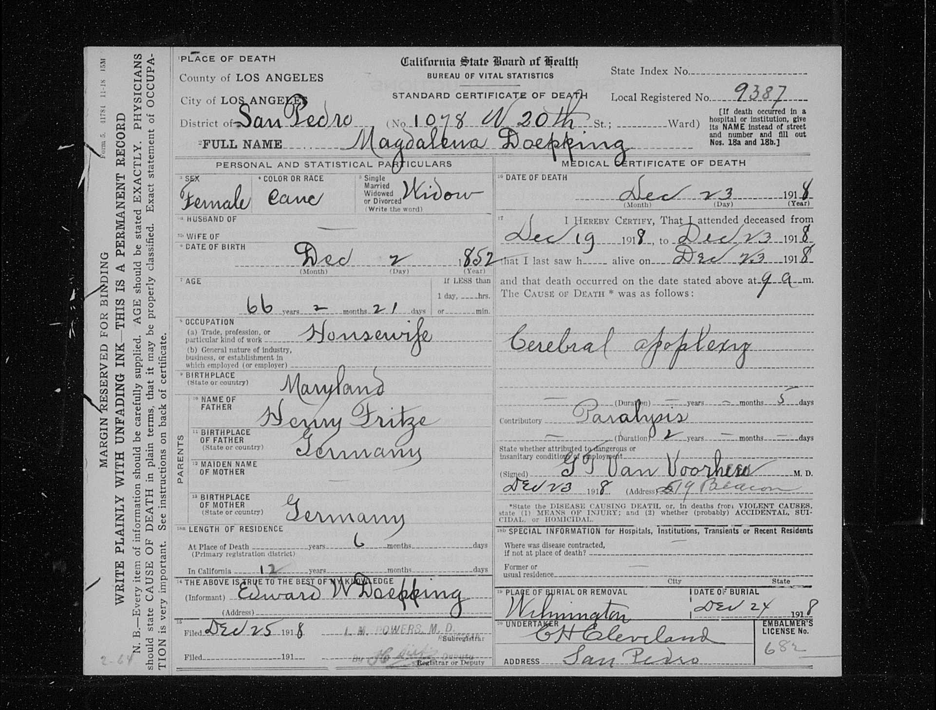 FamilySearch, California County Birth and Death Records, 1800-1994, City of Los Angeles Death certificate 1918-009387, Magdalena Doepping; Database and images, The Church of Jesus Christ of Latter-Day Saints, FamilySearch : 2019 (http://www.FamilySearch.org/ : accessed 09/12/2020) [Surety: 3]. |
