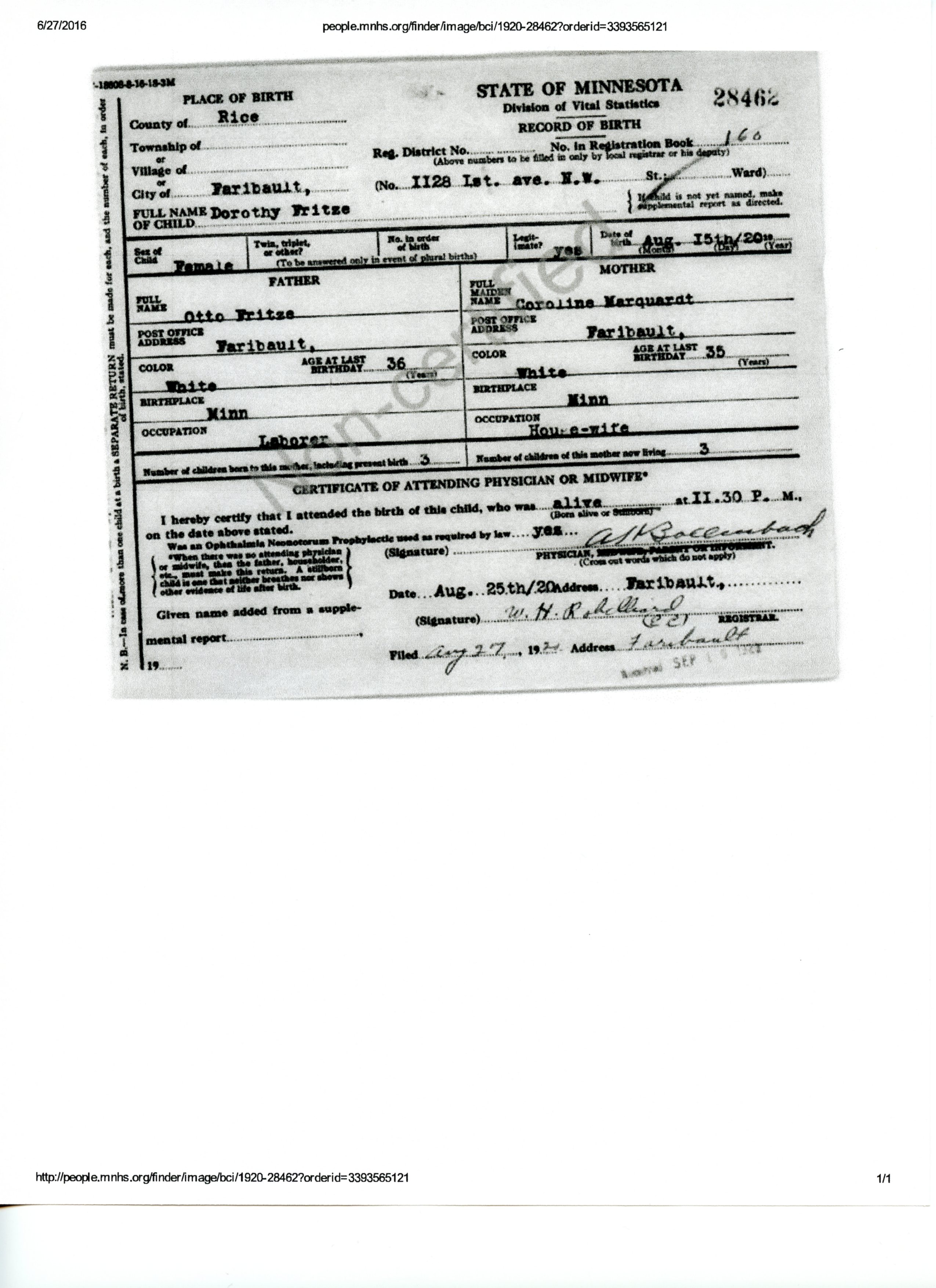 Ancestry.com Operations, Inc., Minnesota Birth Index 1900-1934, Rice County certificate 1920-28462, Dorothy Fritze; Database online, Ancestry.com LLC, Ancestry.com : 2015 (http://www.Ancestry.com/ : accessed 10/14/2015); citing "Minnesota Birth Certificates Index," Minnesota Historical Society, St. Paul, Minnesota (http://people.mnhs.org/search/people) [Surety: 3]. |
