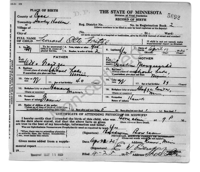 Ancestry.com Operations, Inc., Minnesota Birth Index 1900-1934, Cass County certificate 1925-05092, Leonard Otto Fritze; Database online, Ancestry.com LLC, Ancestry.com : 2015 (http://www.Ancestry.com/ : accessed 12/06/2016); citing "Minnesota Birth Certificates Index," Minnesota Historical Society, St. Paul, Minnesota (http://people.mnhs.org/search/people) [Surety: 3]. |