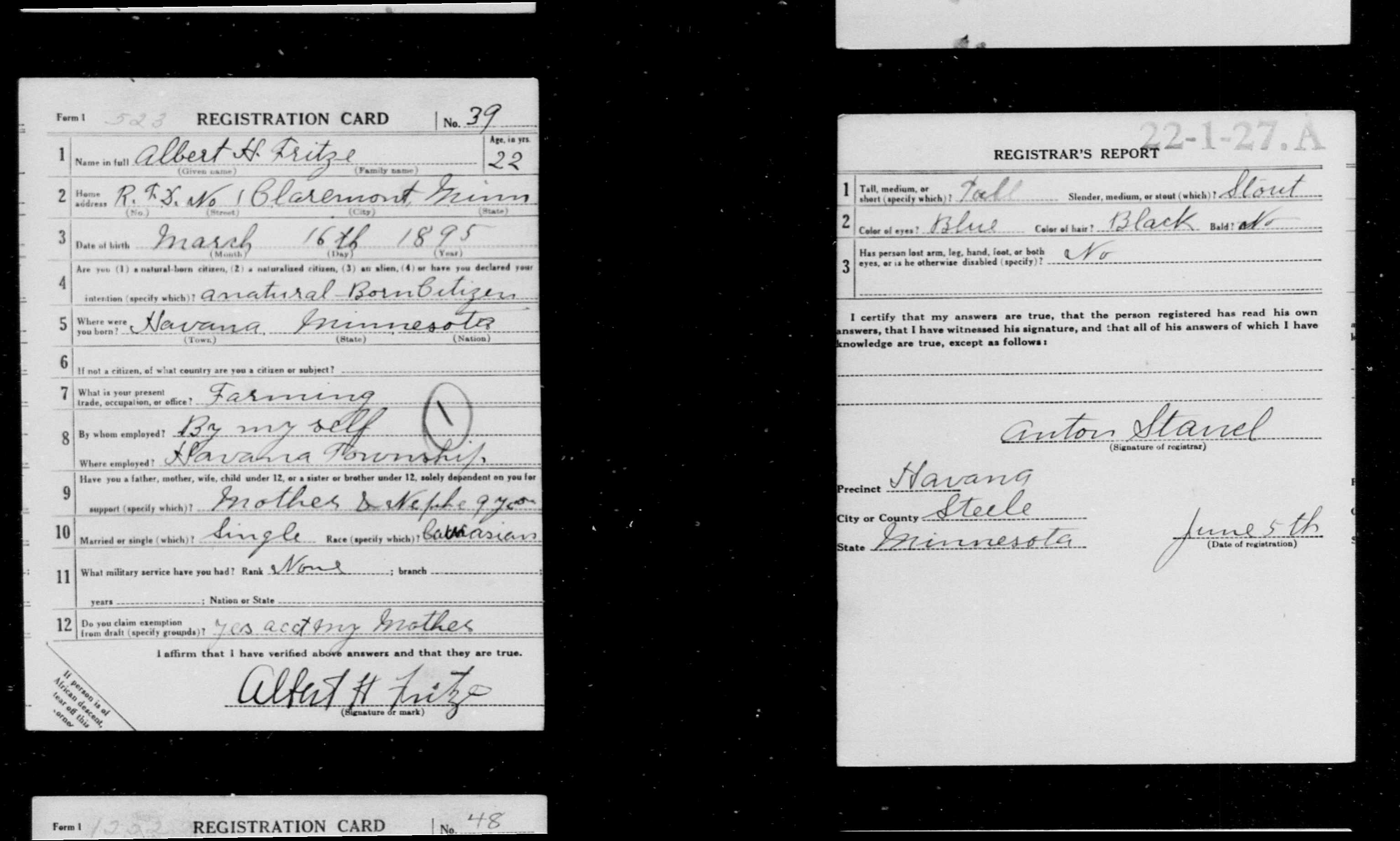 Ancestry.com Operations, Inc., U.S. World War II Draft Registration, 1942, Albert H Fritze; Database and images, Ancestry.com LLC, Ancestry.com : 2010 (http://www.Ancestry.com/ : accessed 07/18/2016); citing United States Selective Service System, Selective Service Registration Cards, World War II: Fourth Registration, National Archives and Records Administration, Records of the Selective Service System, RG 147, roll 529, Minnesota, Steele County, Serial U-01721, Albert H Fritze [Surety: 3]. |