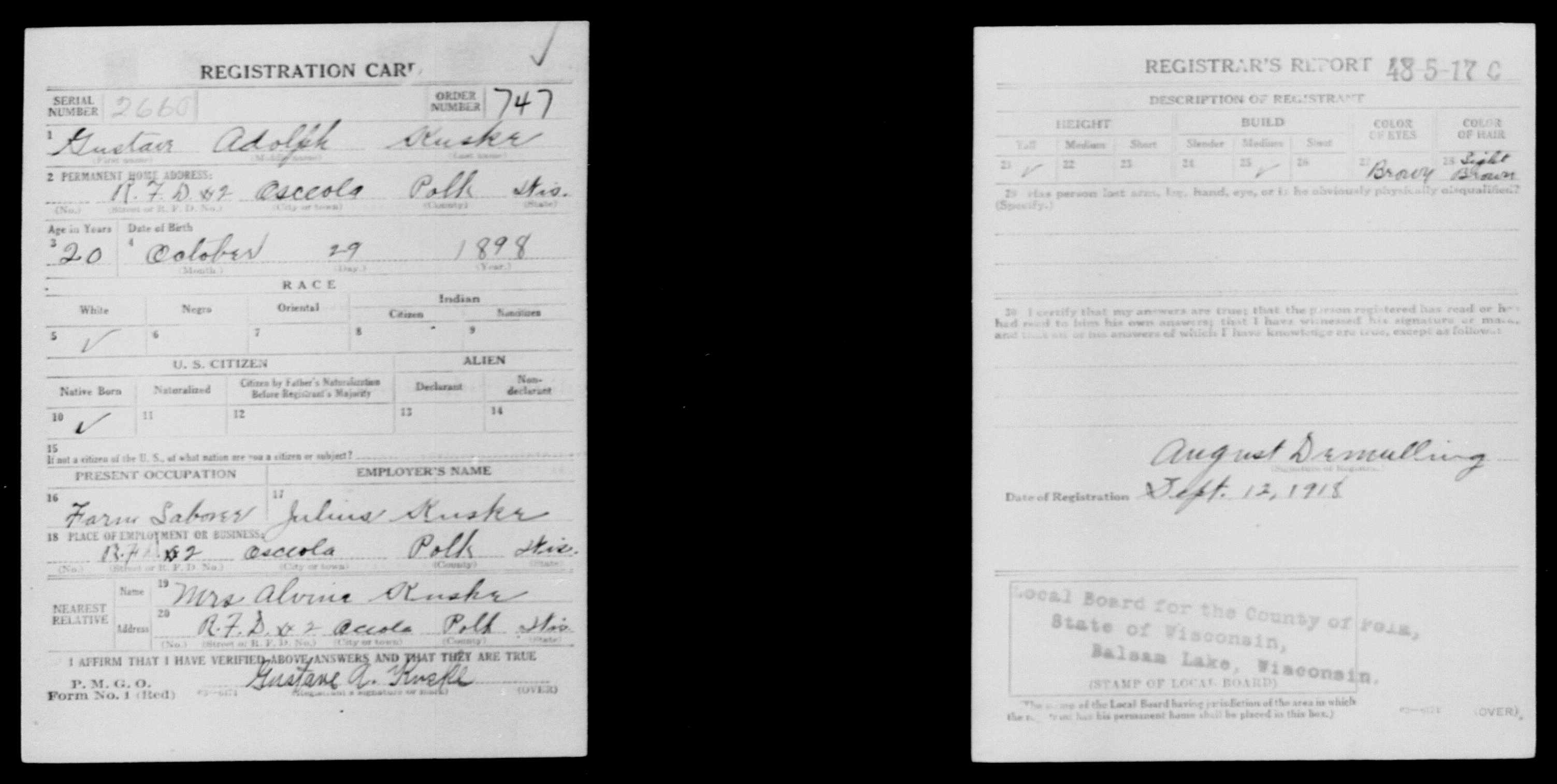 Ancestry.com Operations, Inc., U.S. World War I Draft Registration Cards, 1917-1918, Gustave Adolph Kuske; Database and images, Ancestry.com LLC, Ancestry.com : 2005 (http://www.Ancestry.com/ : accessed 12/02/2010); citing National Archives and Records Administration, United States Selective Service System, "World War I Selective Service System Draft Registration Cards, 1917-1918," Washington, DC, Series M1509, 4,582 rolls, FHL Microfilm 1,674,884 [Surety: 3]. |