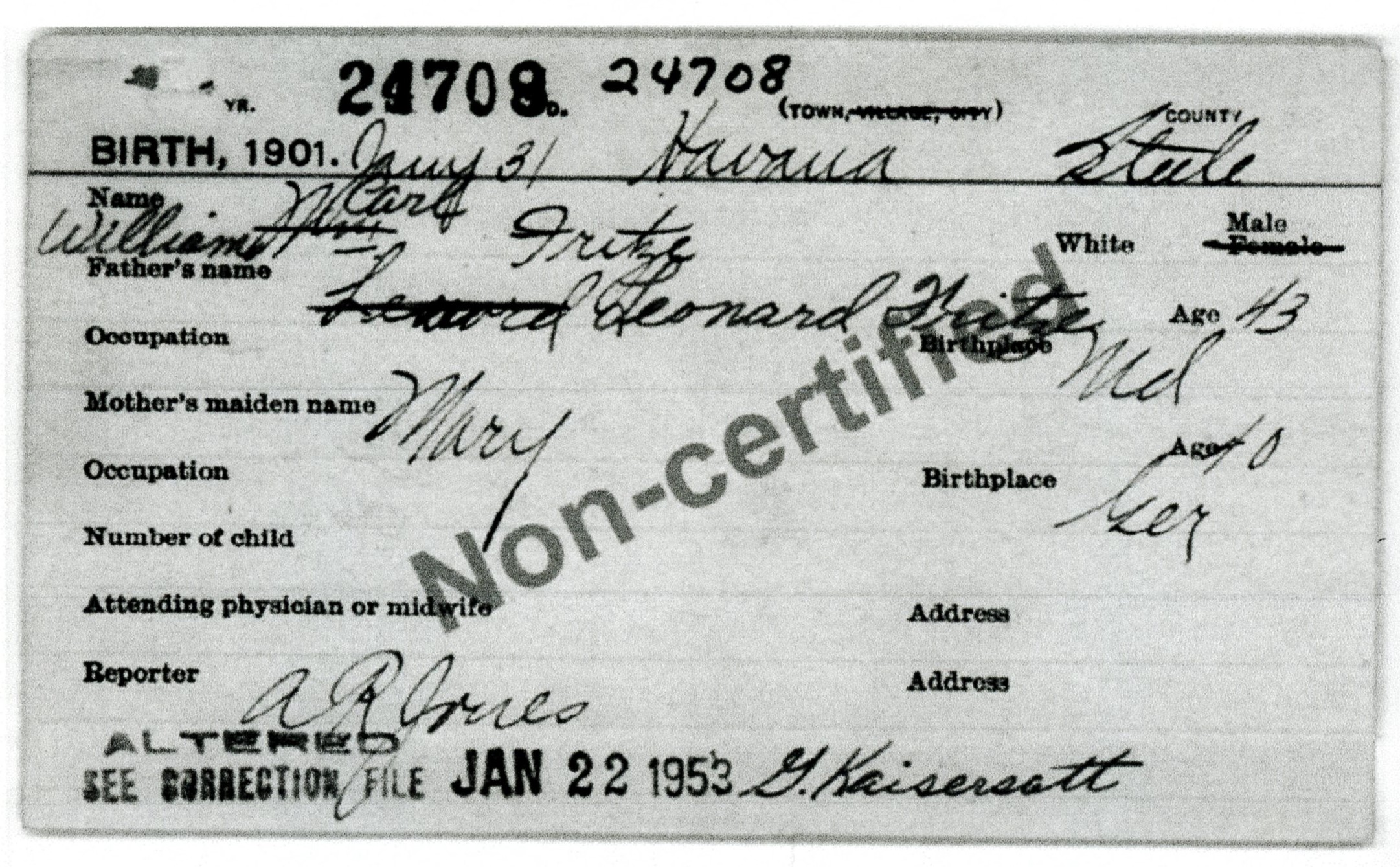 Minnesota Historical Society, "PeopleFinder," Steele County certificate 1901-24708; database, Minnesota Historical Society, MNHS.org Research : n.d. (http://www.mnhs.org/research : accessed 07/08/2015), Birth (Fritze, William Carl) [Surety: 3]. |