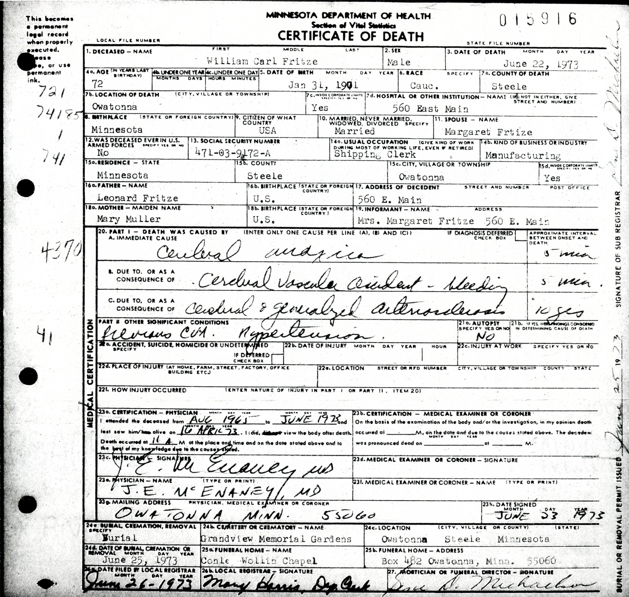 Minnesota, Death Certificate, death certificate no. 14644 (1973), William Carl Fritze [Surety: 3]. |
