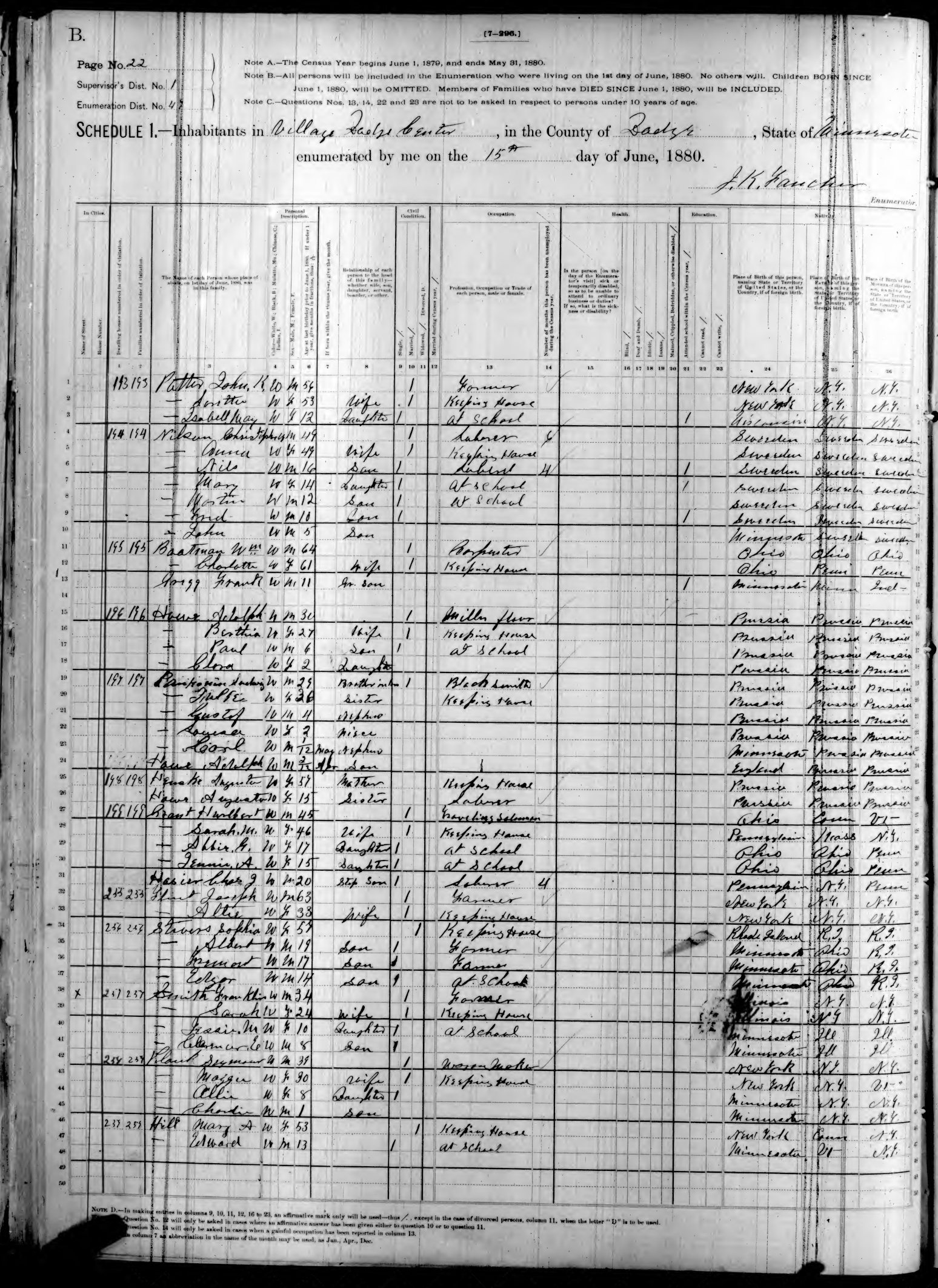 Ancestry.com Operations, Inc., 1880 United States Federal Census, ED 47, Dodge Center, Dodge, MN, page 22, dwelling 196, family 196, line 15, Howe, Paul; Database and images, Ancestry.com LLC, Ancestry.com : 2010 (http://www.Ancestry.com/ : accessed 06/19/2025); citing Tenth Census of the United States, 1880 U. S. Census, population schedules, National Archives and Records Administration Microfilm Publication T9 (1454 rolls), Records of the Bureau of the Census, Record Group 29, National Archives, Washington, DC, roll 618, image 416 [Surety: 3]. |