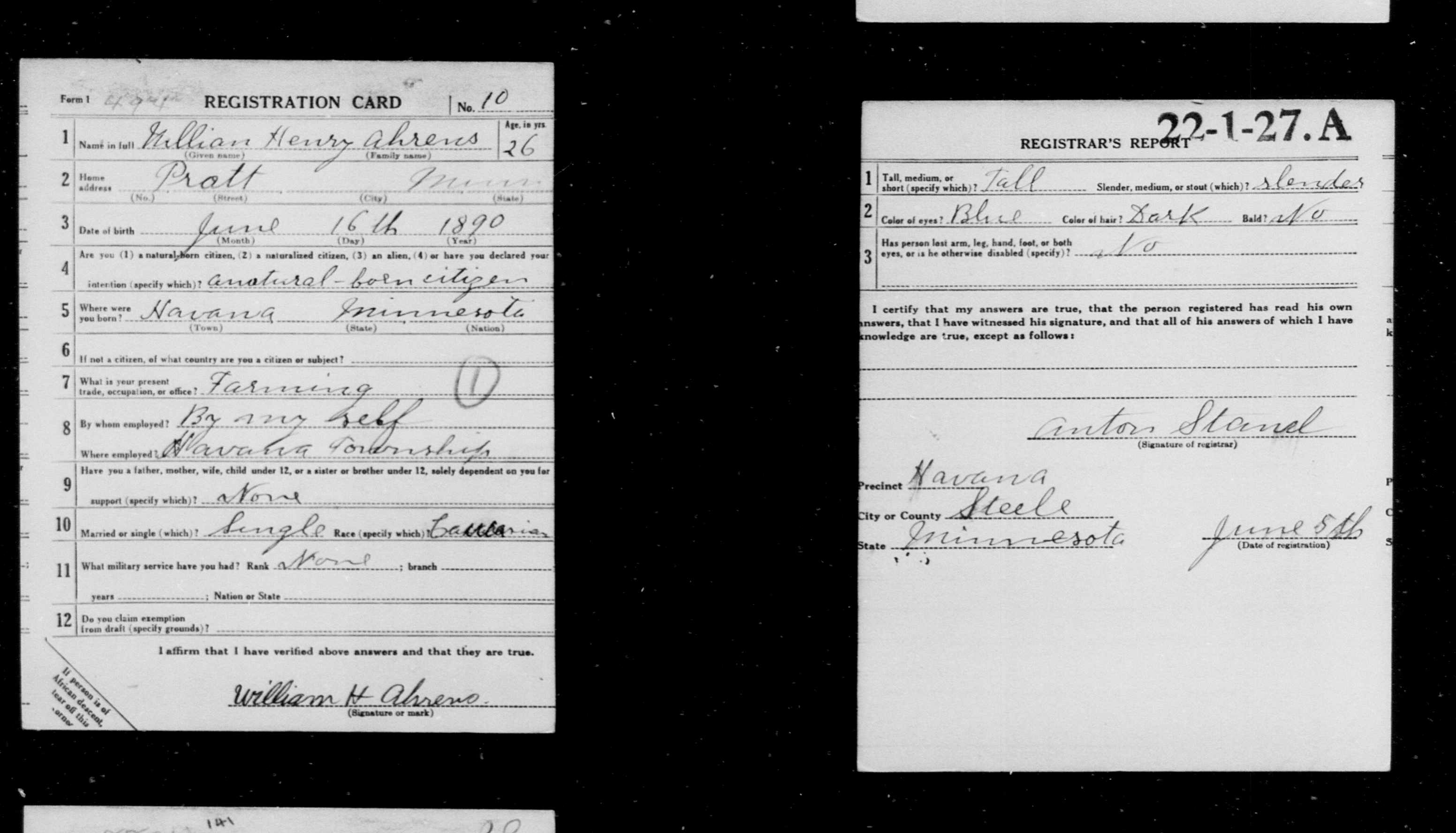 Ancestry.com Operations, Inc., U.S. World War I Draft Registration Cards, 1917-1918, William Henry Ahrens; Database and images, Ancestry.com LLC, Ancestry.com : 2005 (http://www.Ancestry.com/ : accessed 02/16/2011); citing National Archives and Records Administration, United States Selective Service System, "World War I Selective Service System Draft Registration Cards, 1917-1918," Washington, DC, Series M1509, 4,582 rolls [Surety: 3]. |