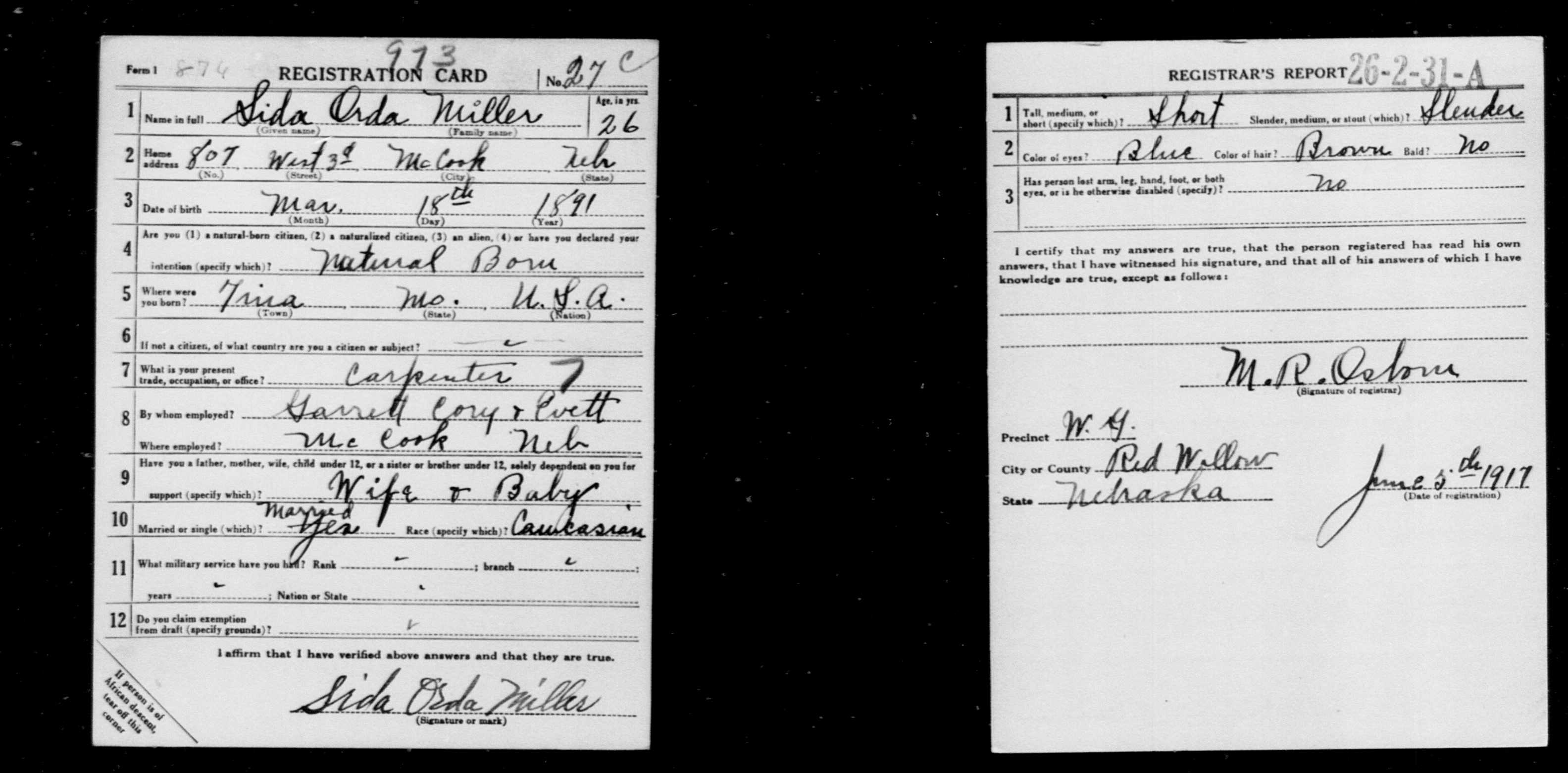 Ancestry.com Operations, Inc., U.S. World War I Draft Registration Cards, 1917-1918, Sida Orda Miller; Database and images, Ancestry.com LLC, Ancestry.com : 2005 (http://www.Ancestry.com/ : accessed 07/21/2016); citing National Archives and Records Administration, United States Selective Service System, "World War I Selective Service System Draft Registration Cards, 1917-1918," Washington, DC, Series M1509, 4,582 rolls, FHL Microfilm 1,711,767 [Surety: 3]. |
