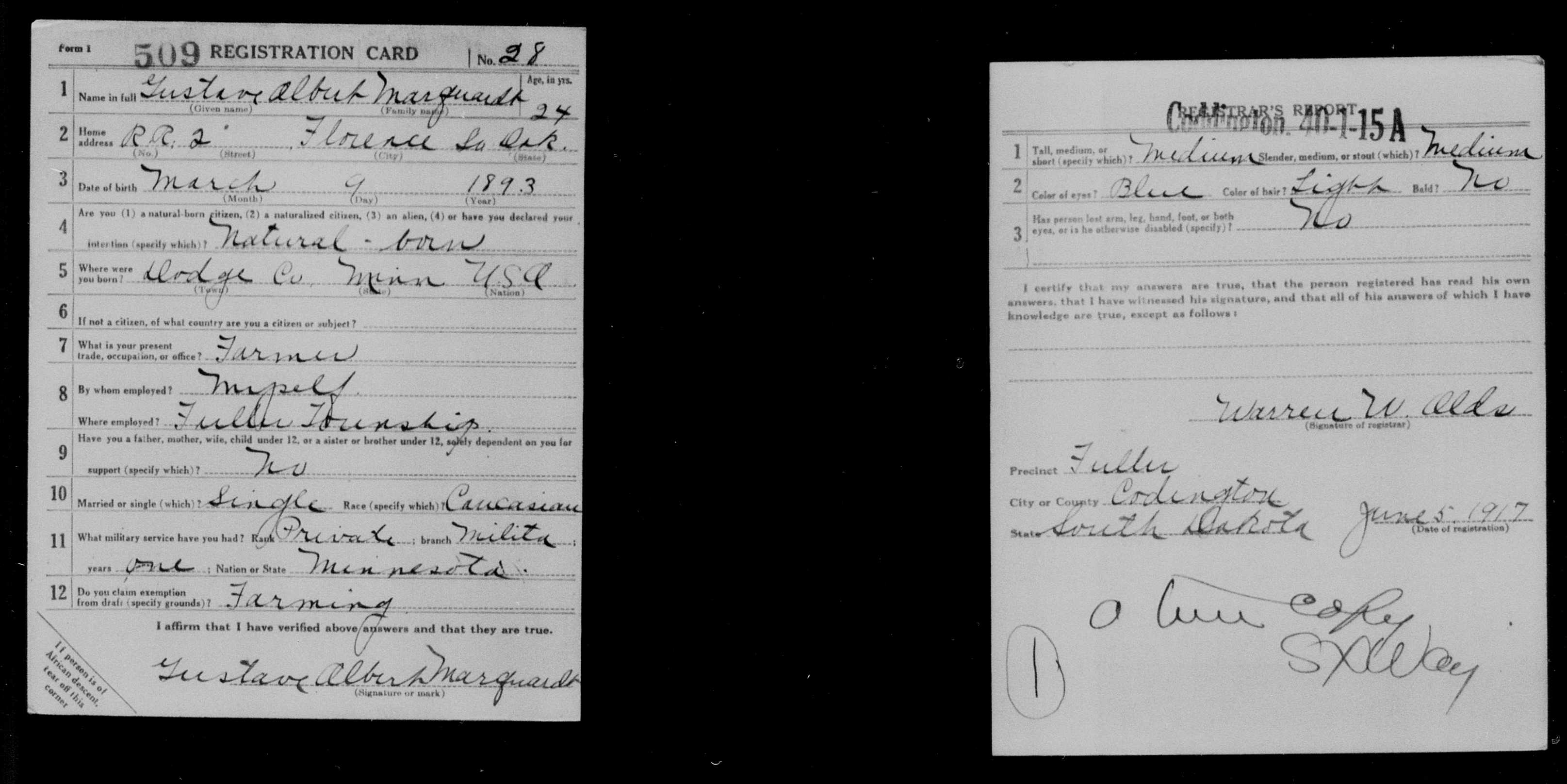 Ancestry.com Operations, Inc., U.S. World War II Draft Registration, 1942, Gustave Albert Marquardt; Database and images, Ancestry.com LLC, Ancestry.com : 2010 (http://www.Ancestry.com/ : accessed 10/08/2019); citing United States Selective Service System, Selective Service Registration Cards, World War II: Fourth Registration, National Archives and Records Administration, Records of the Selective Service System, RG 147, roll 1402, South Dakota, Codington County, Serial U-1343, Gustave Albert Marquardt [Surety: 3]. |