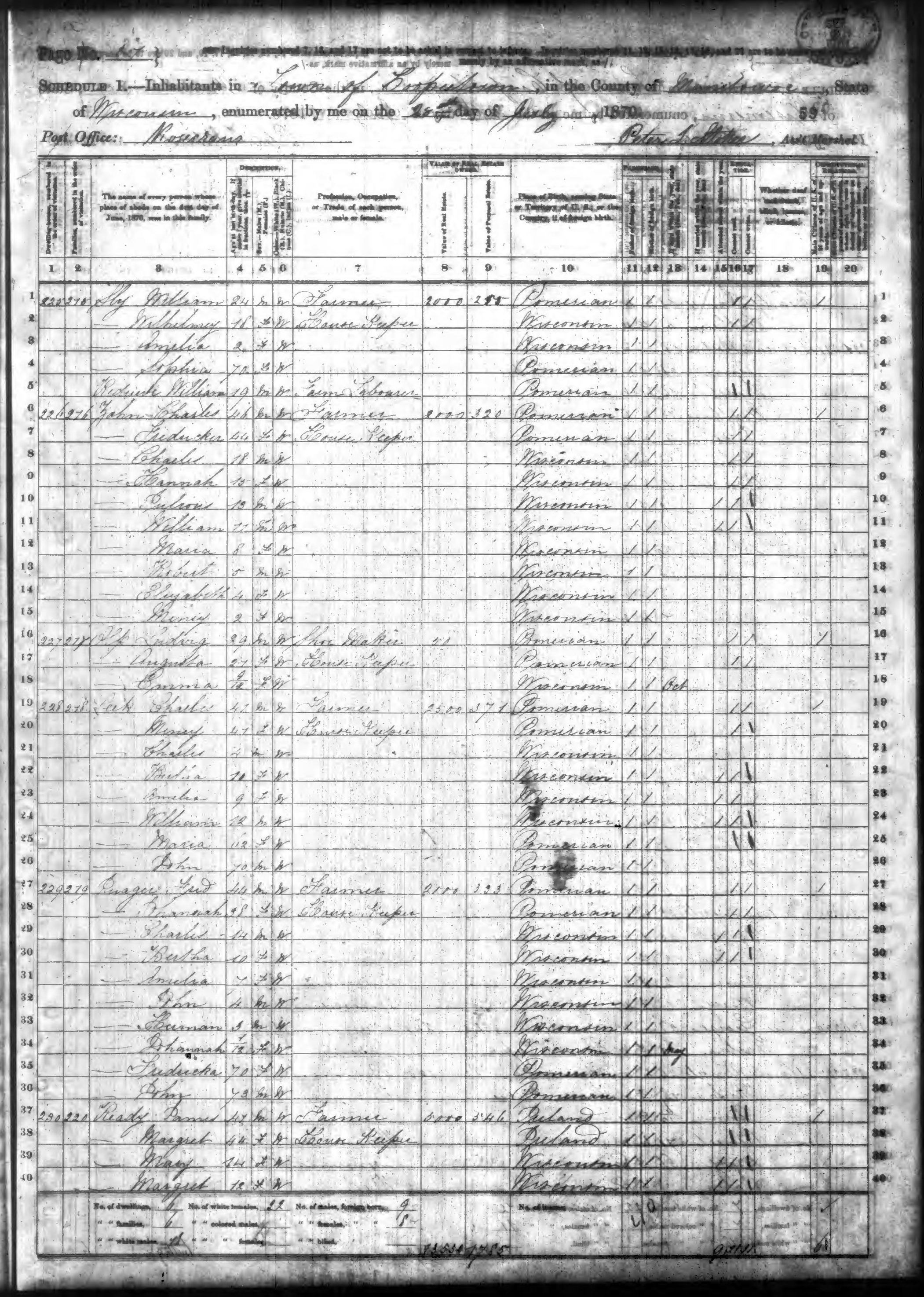 Ancestry.com Operations, Inc., 1870 United States Census, Cooperstown, Mantiwoc, WI, page 31, dwelling 225, family 275, line 4, Sly, Sophia; Database and images, Ancestry.com LLC, Ancestry.com : 2009 (http://www.Ancestry.com/ : accessed 10/28/2013); citing Ninth Census of the United States, 1870 U. S. Census, population schedules, National Archives and Records Administration Microfilm Publication M593 (1761 rolls), Records of the Bureau of the Census, Record Group 29, National Archives, Washington, DC, roll 1723, image 120 [Surety: 3]. |