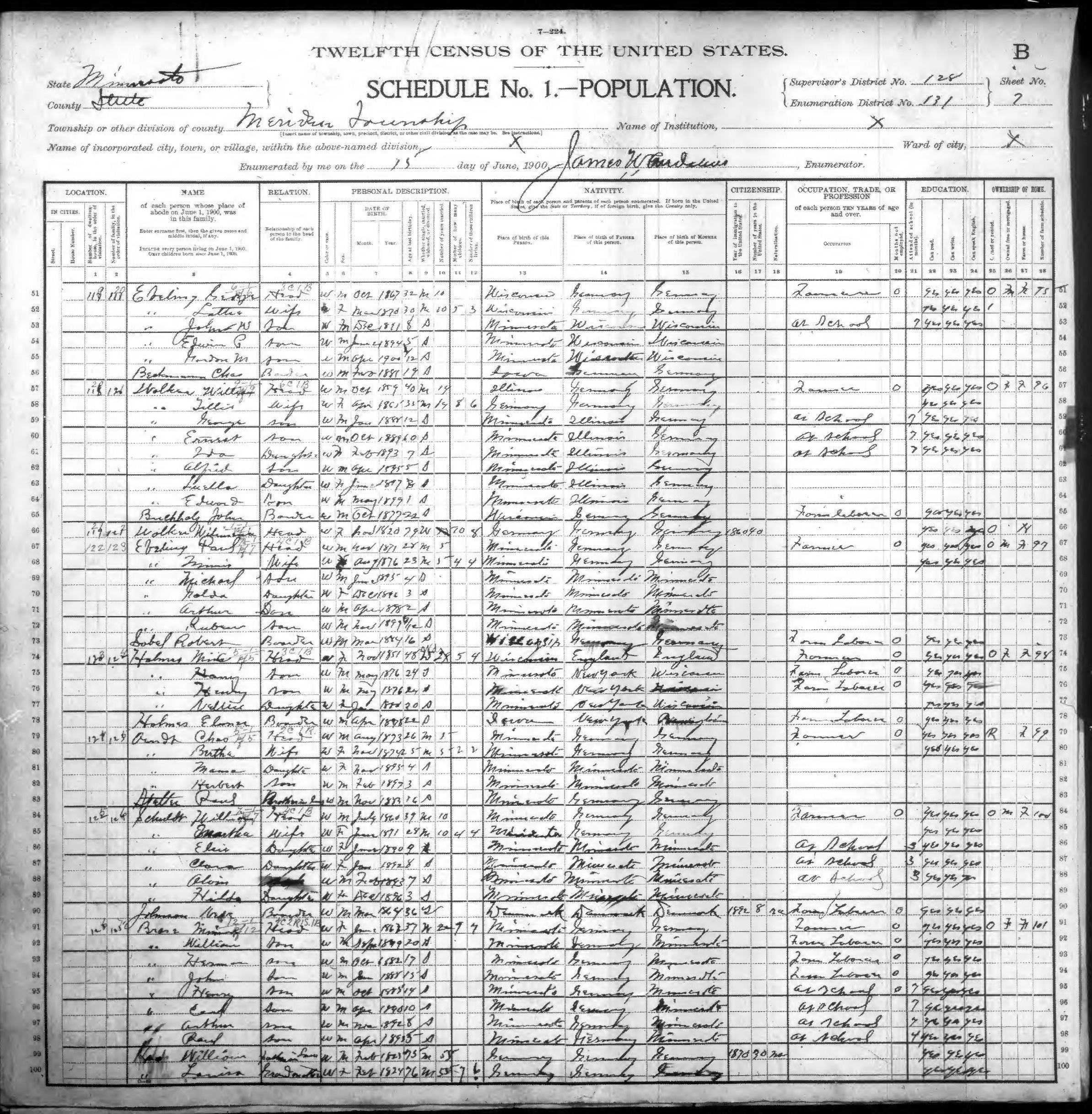 Ancestry.com Operations, Inc., 1900 United States Federal Census, ED 131, Meriden, Steele, MN, sheet 7B, dwelling 120, family 121, line 57, Walker, William; Database and images, Ancestry.com LLC, Ancestry.com : 2010 (http://www.Ancestry.com/ : accessed 12/15/2010); citing Twelth Census of the United States, 1900 U. S. Census, population schedules, National Archives and Records Administration Microfilm Publication T623 (1854 rolls), Records of the Bureau of the Census, Record Group 29, National Archives, Washington, DC, roll 793, image 175 [Surety: 3]. |