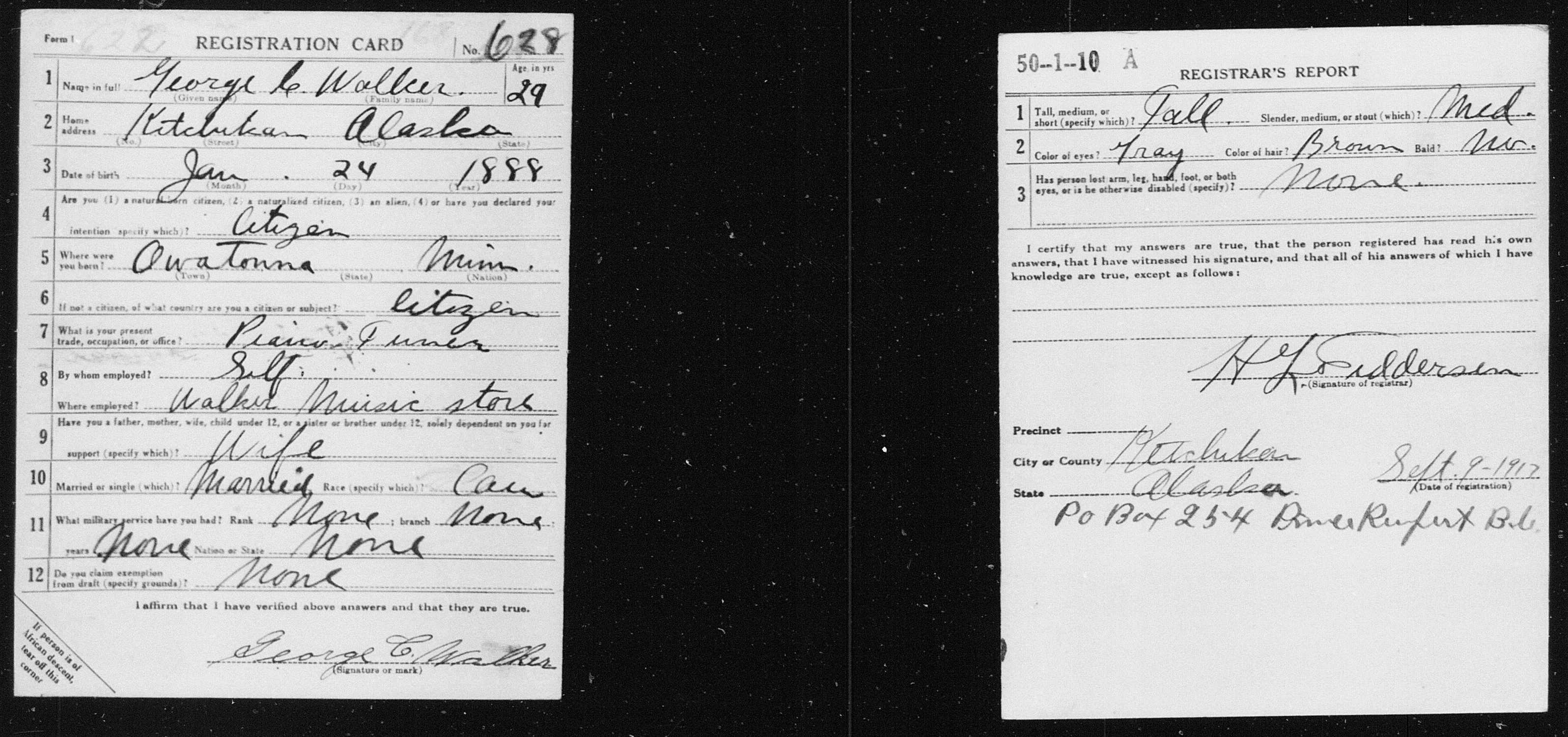 He worked as a piano tuner on 09/09/1918 in Ketchikan, Judicial District 1, Alaska Territory at his self-owned "Walker Music Store.". [5] |