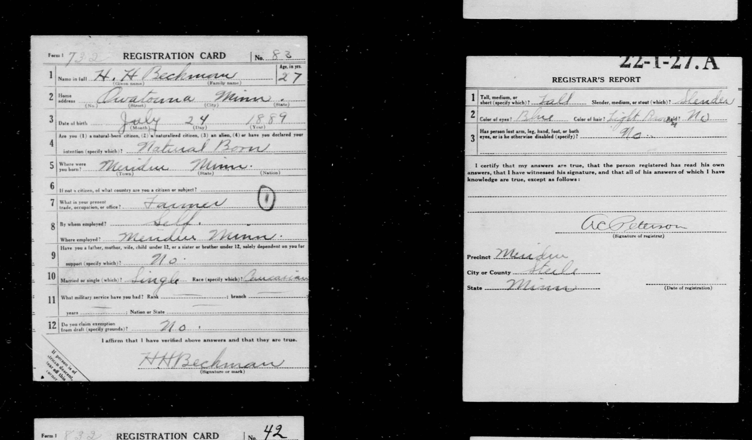 Ancestry.com Operations, Inc., U.S. World War I Draft Registration Cards, 1917-1918, H H Bechman; Database and images, Ancestry.com LLC, Ancestry.com : 2005 (http://www.Ancestry.com/ : accessed 04/15/2011); citing National Archives and Records Administration, United States Selective Service System, "World War I Selective Service System Draft Registration Cards, 1917-1918," Washington, DC, Series M1509, 4,582 rolls [Surety: 3]. |