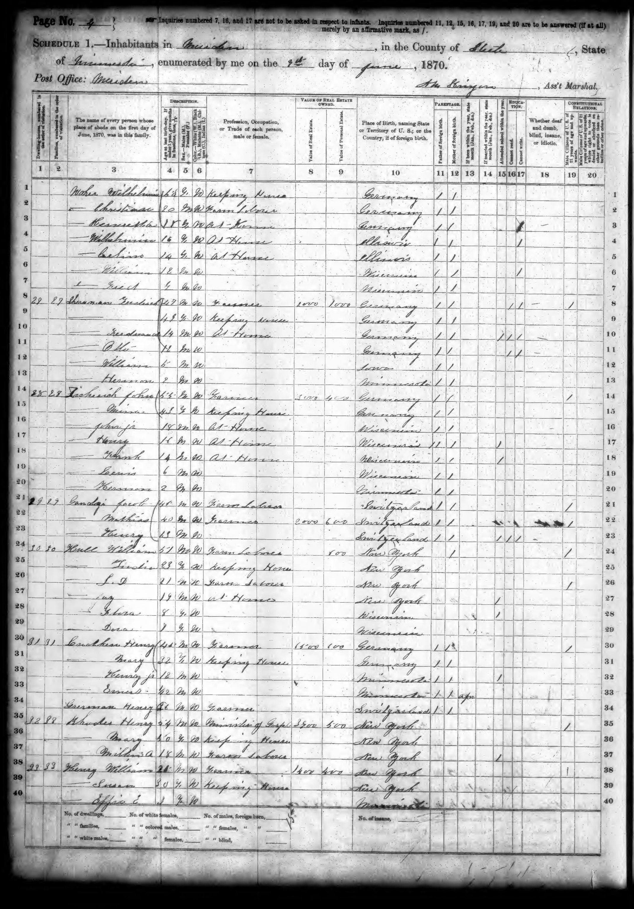Ancestry.com Operations, Inc., 1870 United States Census, Meriden, Steele, MN, page 4, dwelling 26, family 26, line 2, Woker, Christian; Database and images, Ancestry.com LLC, Ancestry.com : 2009 (http://www.Ancestry.com/ : accessed 12/15/2010); citing Ninth Census of the United States, 1870 U. S. Census, population schedules, National Archives and Records Administration Microfilm Publication M593 (1761 rolls), Records of the Bureau of the Census, Record Group 29, National Archives, Washington, DC, roll 716, image 476 [Surety: 3]. |