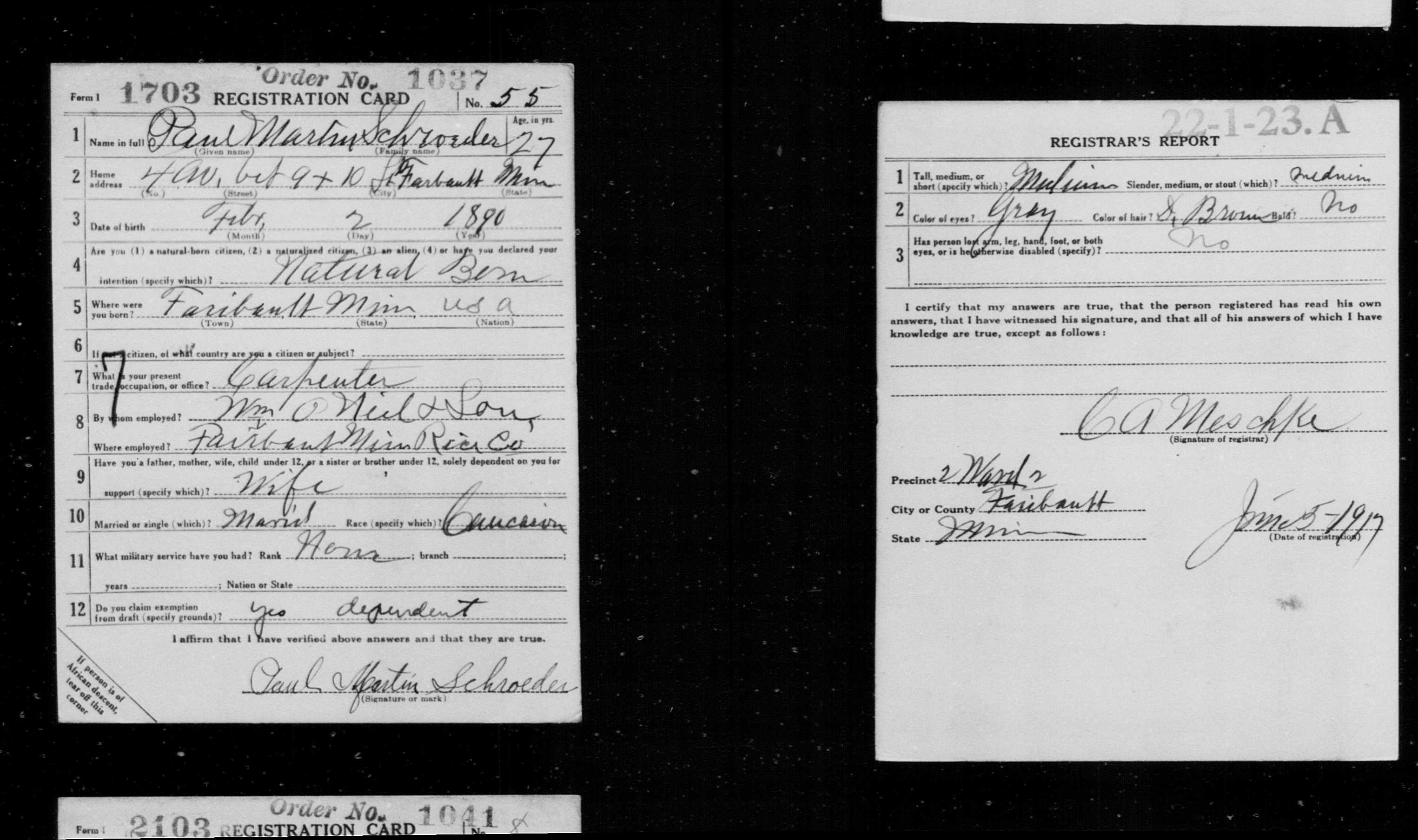 He was described as of medium height and build with grey eys and brown hair on 06/05/1917 in Faribault, Rice, Minnesota . [6] |