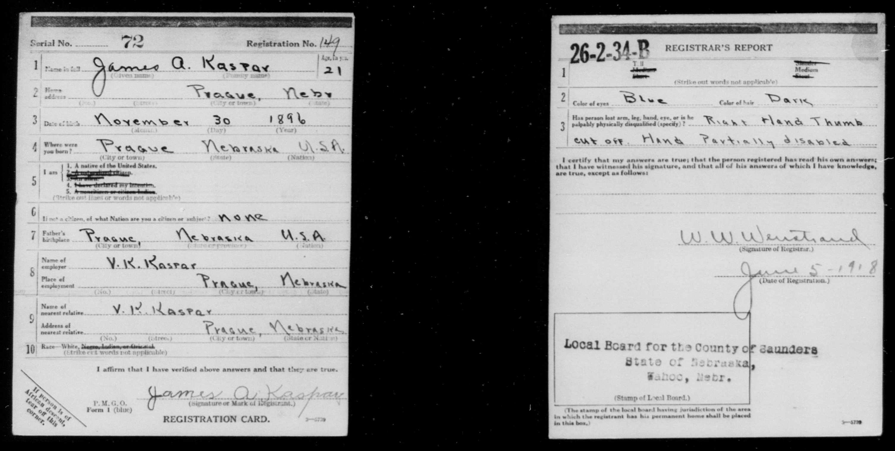 He was described as tall and of medium build with blue eyes and dark hair on 06/05/1918 in Wahoo, Saunders, Nebraska and partially disabled because his right thumb had been cut off. [10] |