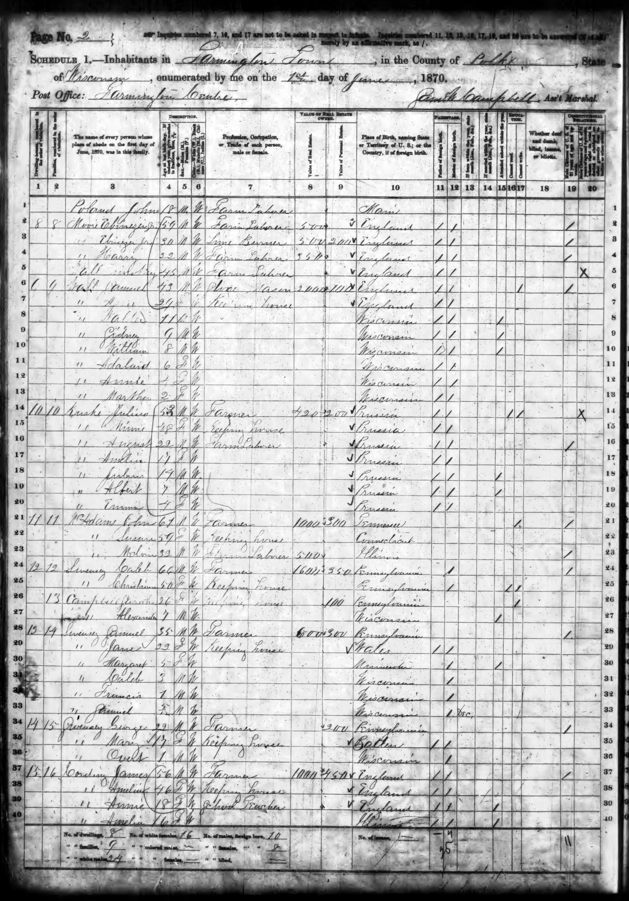 Ancestry.com Operations, Inc., 1870 United States Census, Farmington, Polk, WI, page 2, dwelling 10, family 10, line 18, Knake, Julius; Database and images, Ancestry.com LLC, Ancestry.com : 2009 (http://www.Ancestry.com/ : accessed 09/03/2012); citing Ninth Census of the United States, 1870 U. S. Census, population schedules, National Archives and Records Administration Microfilm Publication M593 (1761 rolls), Records of the Bureau of the Census, Record Group 29, National Archives, Washington, DC, roll 1732, image 33 [Surety: 3]. |