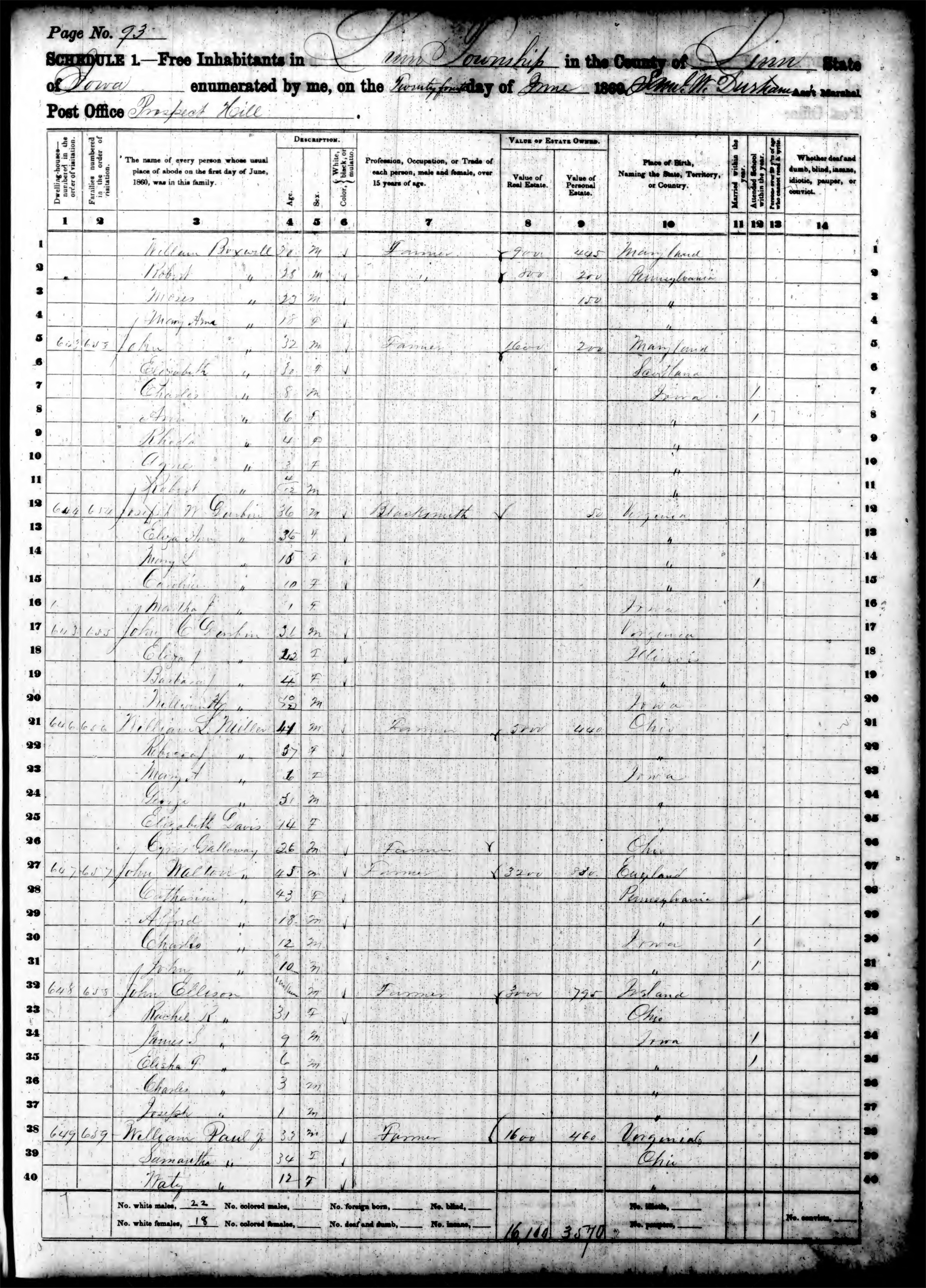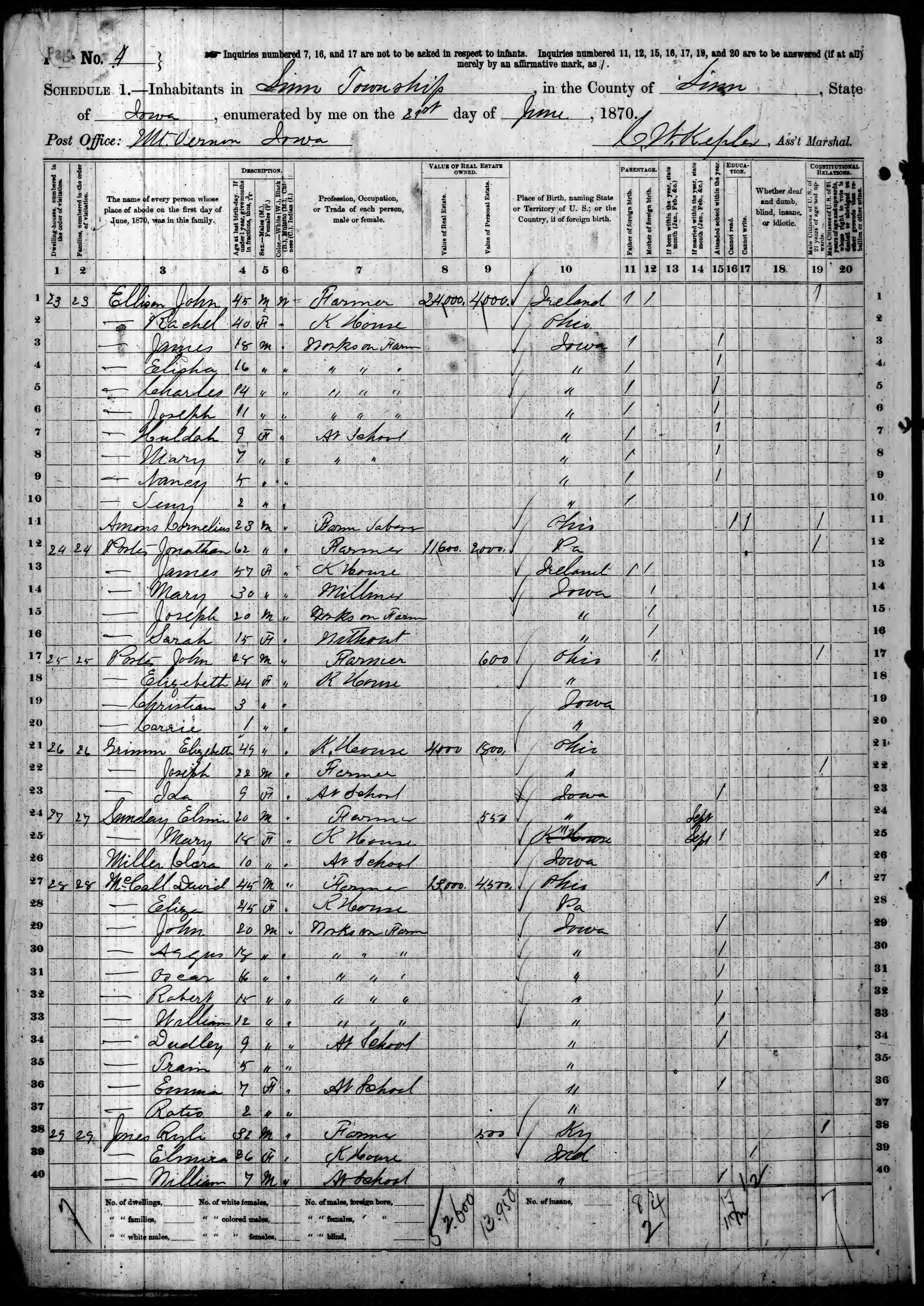 Ancestry.com Operations, Inc., 1870 United States Census, Linn, Linn, IA, page 4, dwelling 23, family 23, line 4, Ellison, Elisha; Database and images, Ancestry.com LLC, Ancestry.com : 2009 (http://www.Ancestry.com/ : accessed 07/14/2021); citing Ninth Census of the United States, 1870 U. S. Census, population schedules, National Archives and Records Administration Microfilm Publication M593 (1761 rolls), Records of the Bureau of the Census, Record Group 29, National Archives, Washington, DC, roll 405, image 487 [Surety: 3]. |