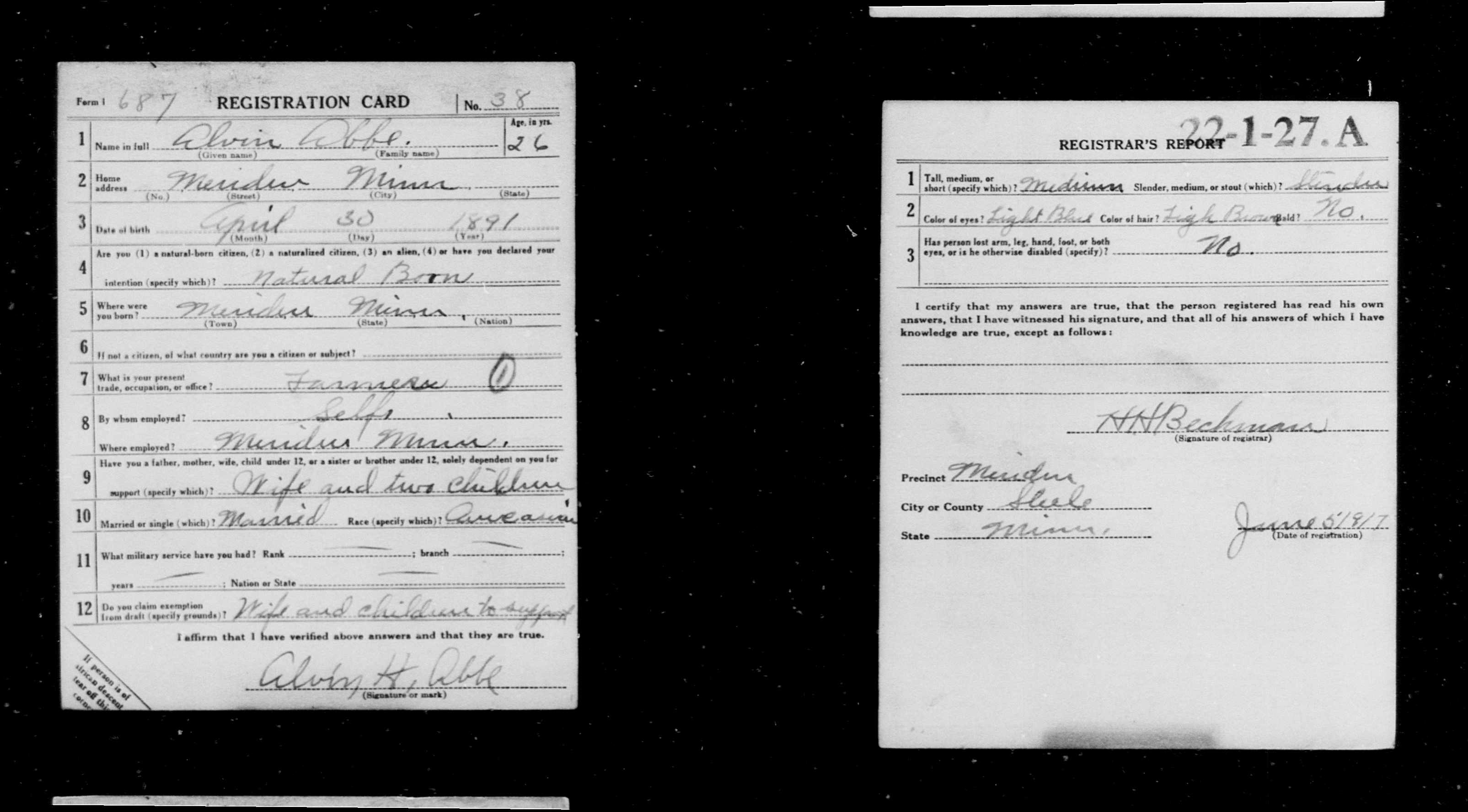Ancestry.com Operations, Inc., U.S. World War I Draft Registration Cards, 1917-1918, Alvin Abbe; Database and images, Ancestry.com LLC, Ancestry.com : 2005 (http://www.Ancestry.com/ : accessed 01/20/2015); citing National Archives and Records Administration, United States Selective Service System, "World War I Selective Service System Draft Registration Cards, 1917-1918," Washington, DC, Series M1509, 4,582 rolls [Surety: 3]. |