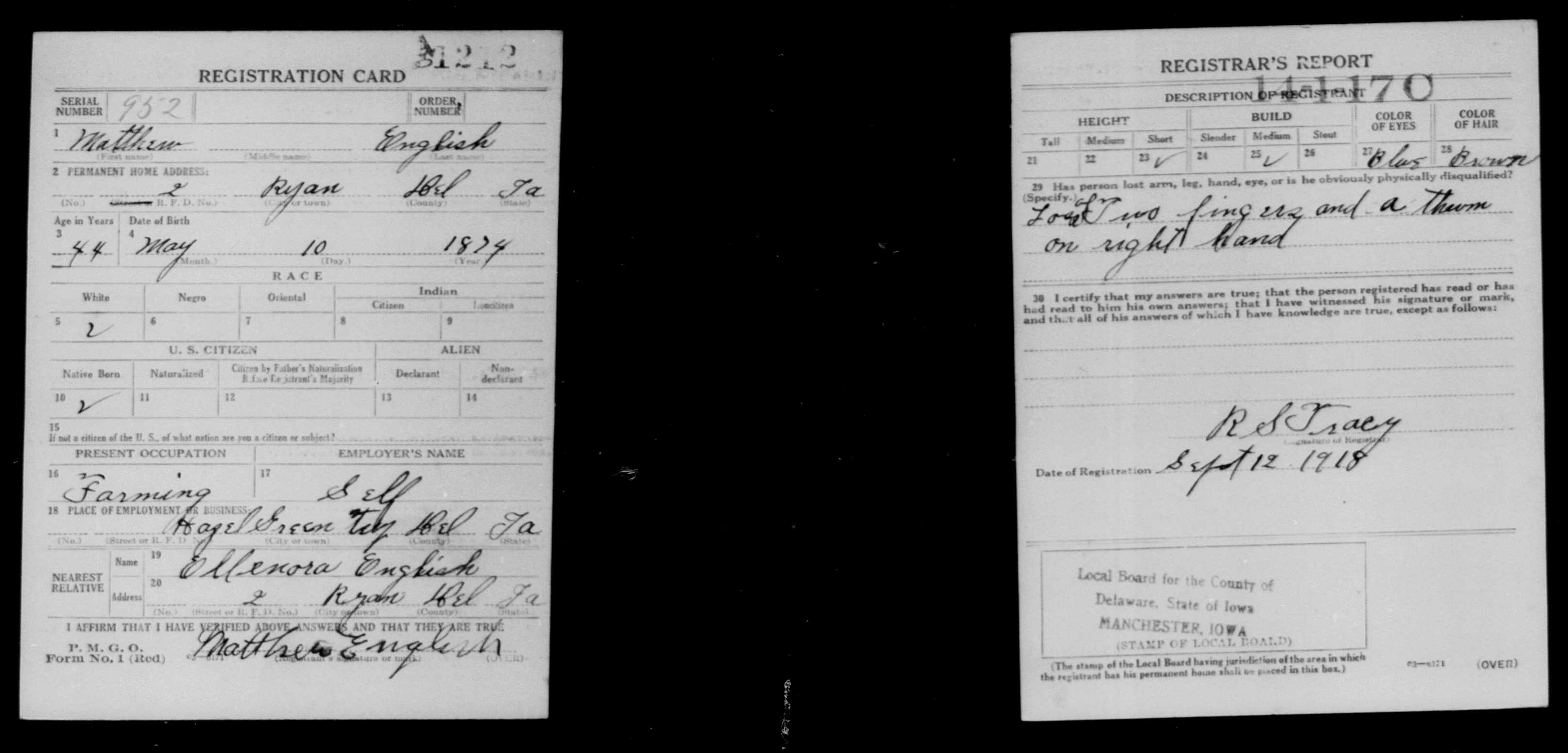 He registered for the Draft for World War I on 09/12/1918 in Ryan, Delaware, Iowa . [7] |