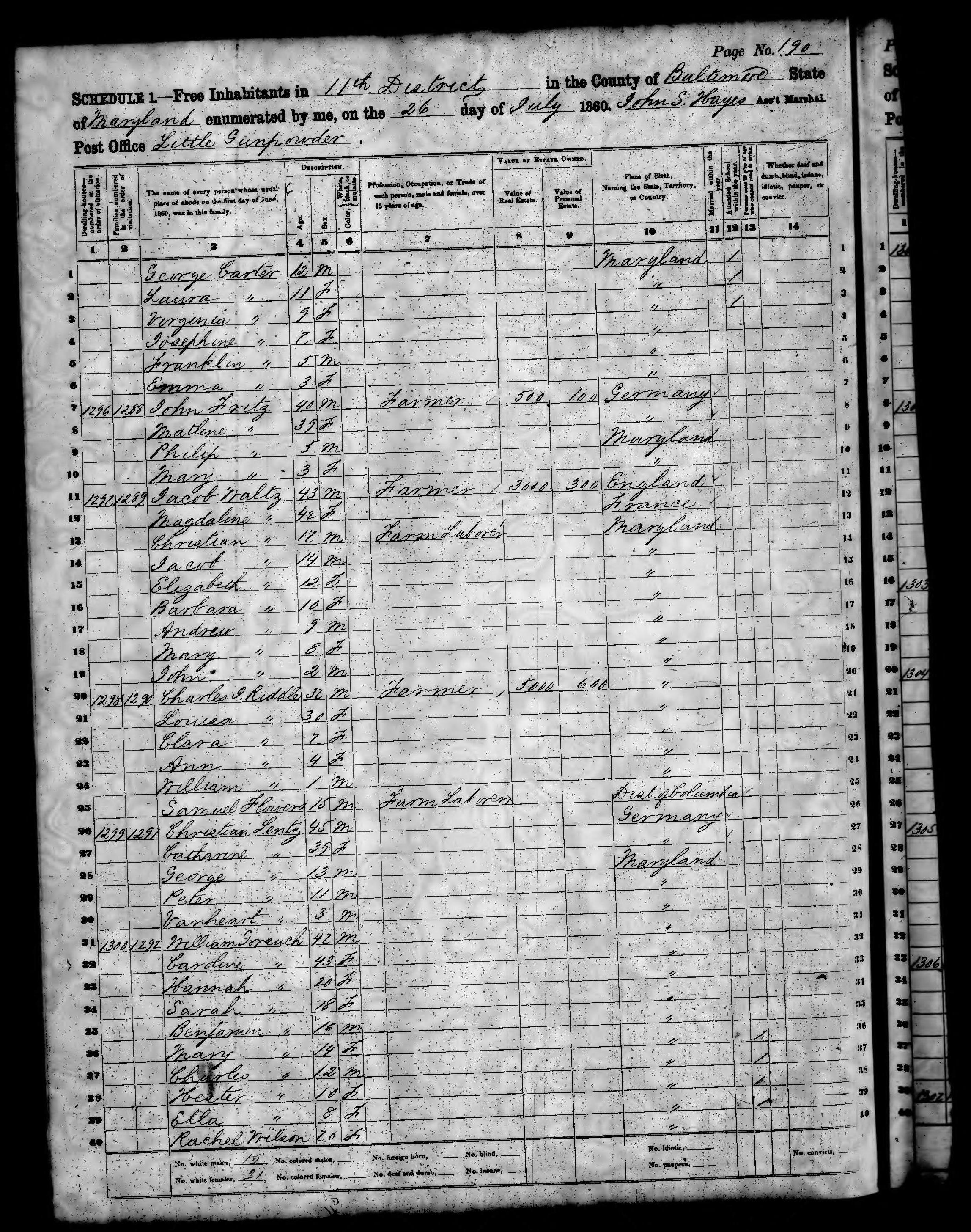 Ancestry.com Operations, Inc., 1860 United States Federal Census, District 11, Little Gunpowder, Baltimore, MD, page 190, dwelling 1296, family 1288, line 10, Mary Fritz; Database and images, Ancestry.com LLC, Ancestry.com : 2009 (http://www.Ancestry.com/ : accessed 01/14/2011); citing Eighth Census of the United States, 1860 U. S. Census, population schedules, National Archives and Records Administration Microfilm Publication M653 (1438 rolls), Records of the Census Bureau, Record Group 29, National Archives, Washington, DC, roll 469, image 103 [Surety: 3]. |