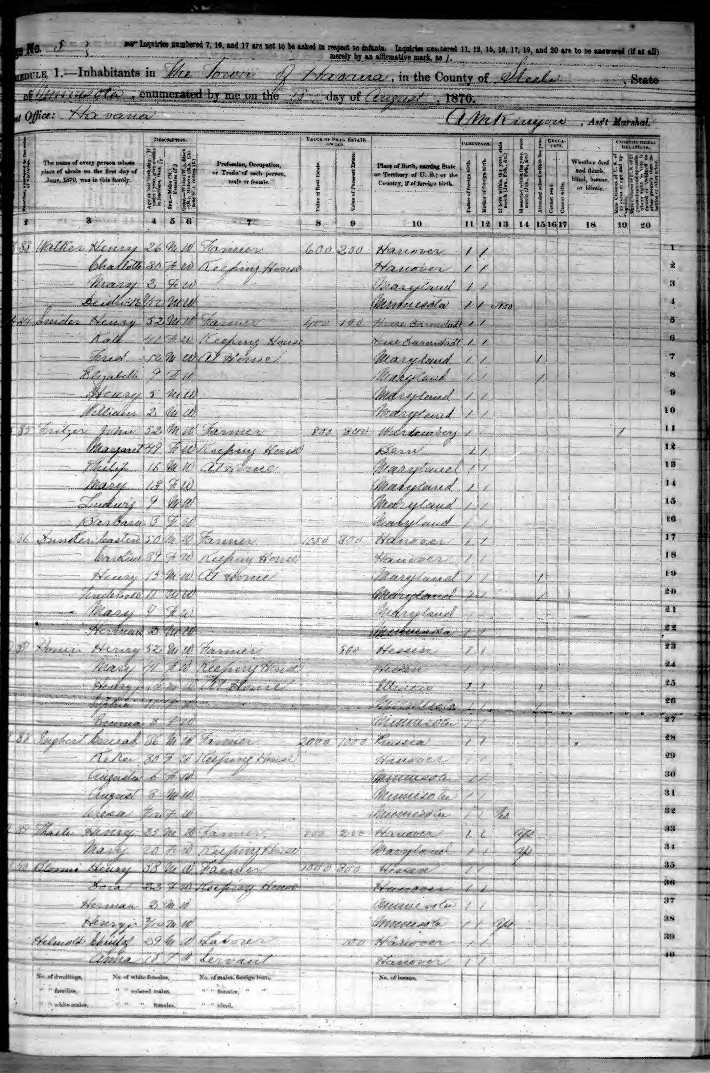 Ancestry.com Operations, Inc., 1870 United States Census, Havana, Steele, MN, page 5, dwelling 35, family 35, line 14, Fritzer, Mary; Database and images, Ancestry.com LLC, Ancestry.com : 2009 (http://www.Ancestry.com/ : accessed 12/03/2010); citing Ninth Census of the United States, 1870 U. S. Census, population schedules, National Archives and Records Administration Microfilm Publication M593 (1761 rolls), Records of the Bureau of the Census, Record Group 29, National Archives, Washington, DC, roll 11, image 358 [Surety: 3]. |
