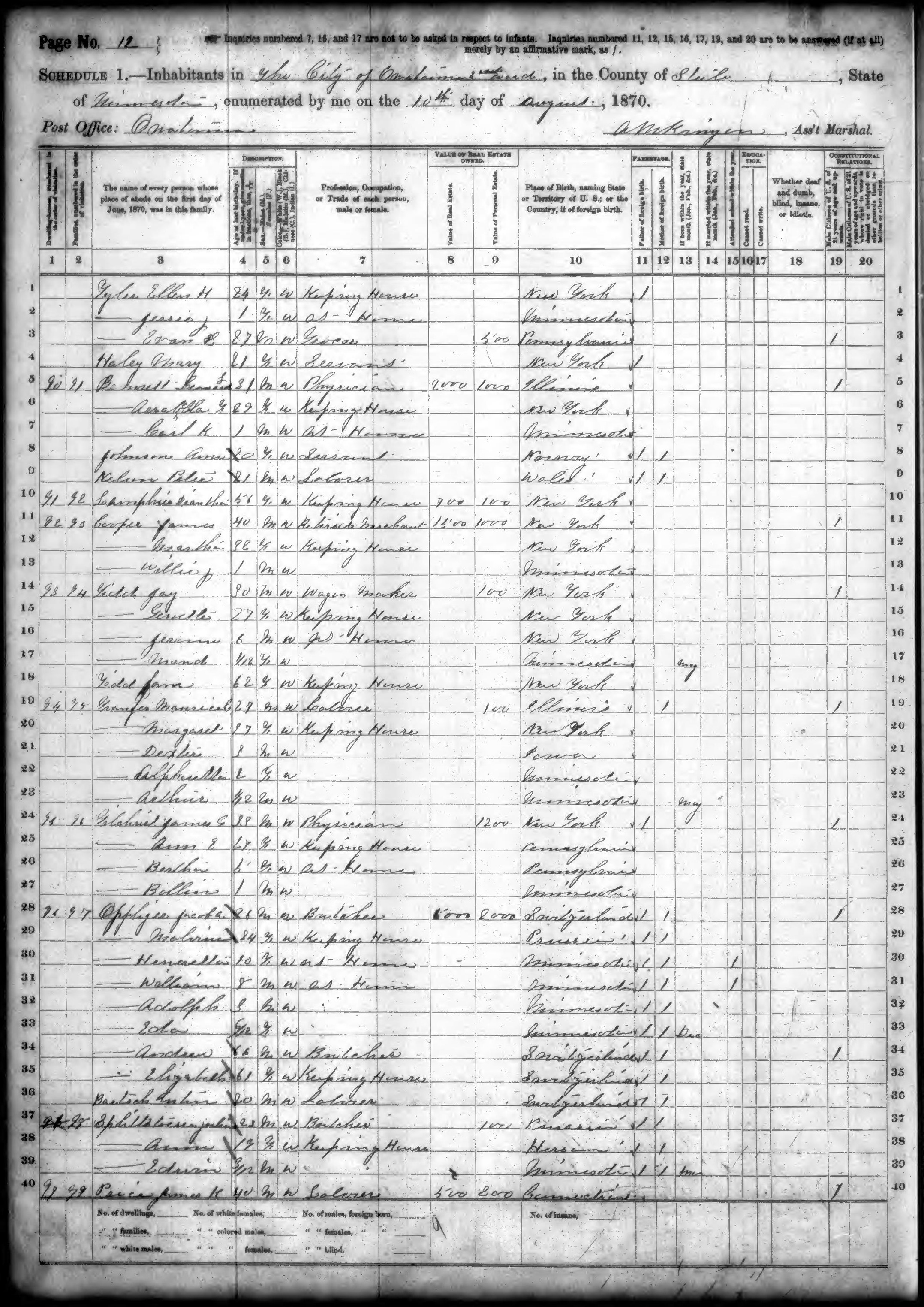 Ancestry.com Operations, Inc., 1870 United States Census, Ward 2, Owatonna, Steele, MN, page 12, dwelling 96, family 98, line 37, Splittstoeser, Julius; Database and images, Ancestry.com LLC, Ancestry.com : 2009 (http://www.Ancestry.com/ : accessed 01/17/2011); citing Ninth Census of the United States, 1870 U. S. Census, population schedules, National Archives and Records Administration Microfilm Publication M593 (1761 rolls), Records of the Bureau of the Census, Record Group 29, National Archives, Washington, DC, roll 716, image 574 [Surety: 3]. |