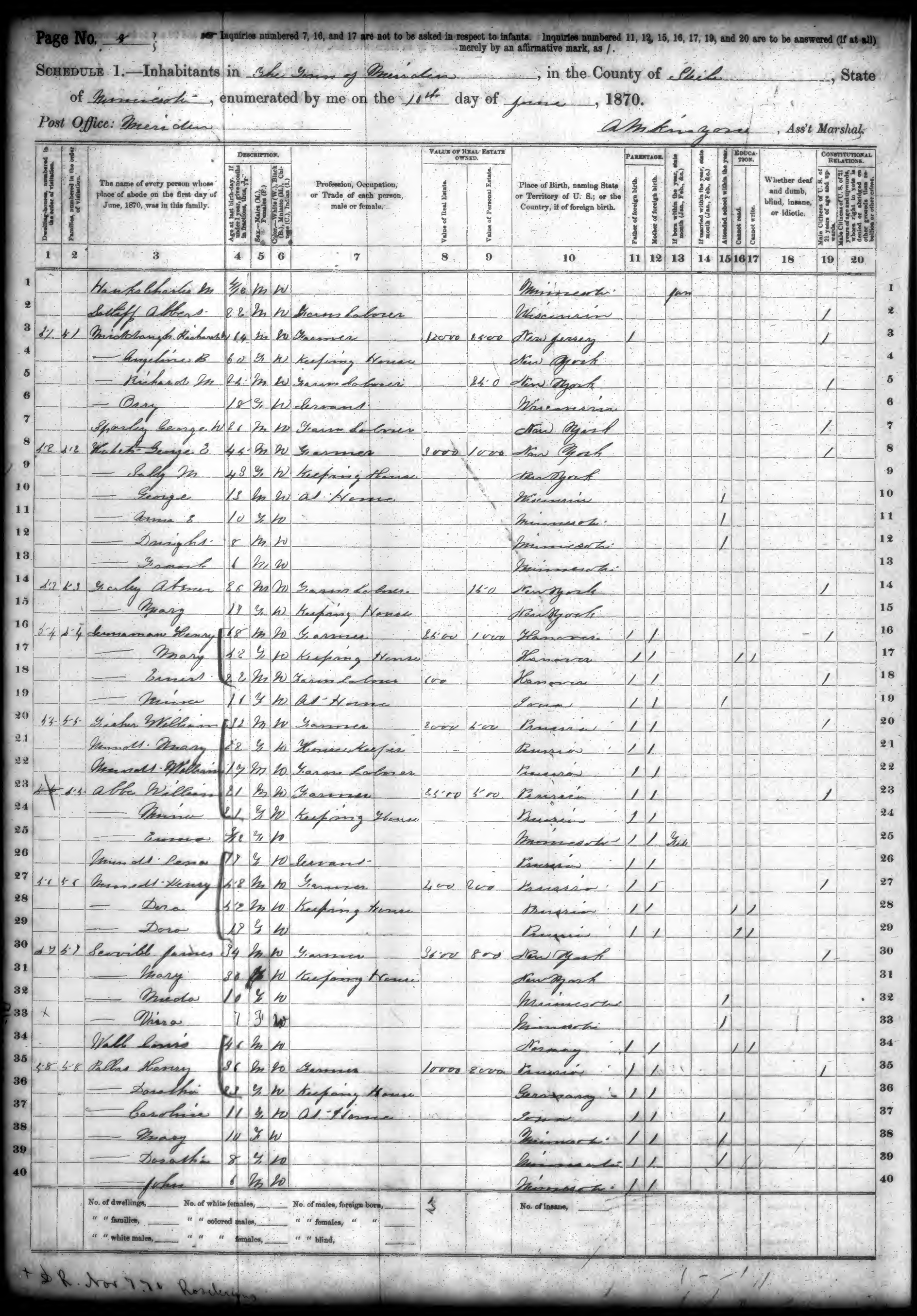 Ancestry.com Operations, Inc., 1870 United States Census, Meriden, Steele, MN, page 8, dwelling 55, family 55, line 26, Mundt, Lena; Database and images, Ancestry.com LLC, Ancestry.com : 2009 (http://www.Ancestry.com/ : accessed 02/07/2021); citing Ninth Census of the United States, 1870 U. S. Census, population schedules, National Archives and Records Administration Microfilm Publication M593 (1761 rolls), Records of the Bureau of the Census, Record Group 29, National Archives, Washington, DC, roll 716, image 481 [Surety: 3]. |