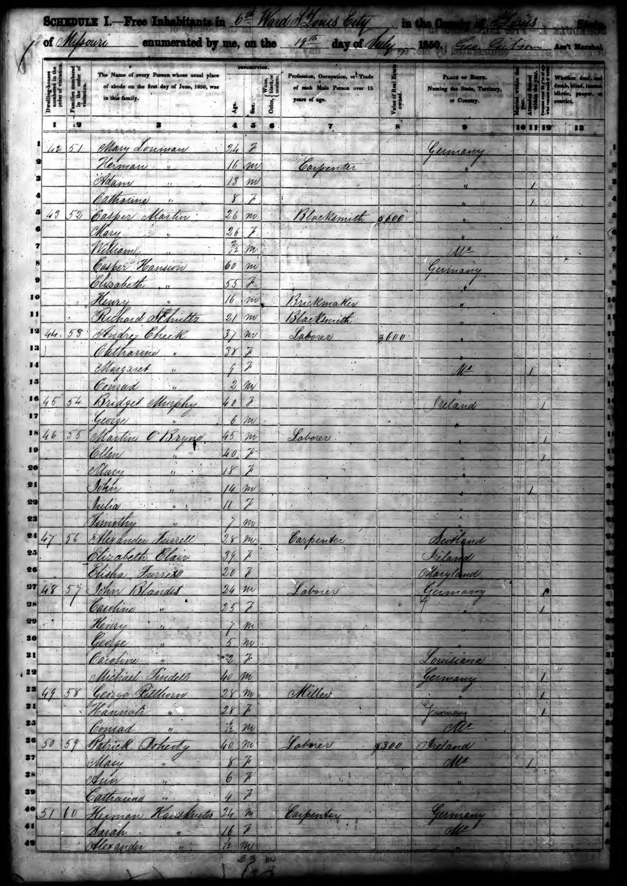 Ancestry.com Operations, Inc., 1850 United States Federal Census, Ward 6, Saint Louis City, MO, page 6, dwelling 42, family 51, line 3, Adam Louman; Database and images, Ancestry.com LLC, Ancestry.com : 2009 (http://www.Ancestry.com/ : accessed 12/09/2013); citing Seventh Census of the United States, 1850 U. S. Census, population schedules, National Archives and Records Administration Microfilm Publication M432 (1009 rolls), Records of the Census Bureau, Record Group 29, National Archives, Washington, DC, roll 418, image 9 [Surety: 3]. |