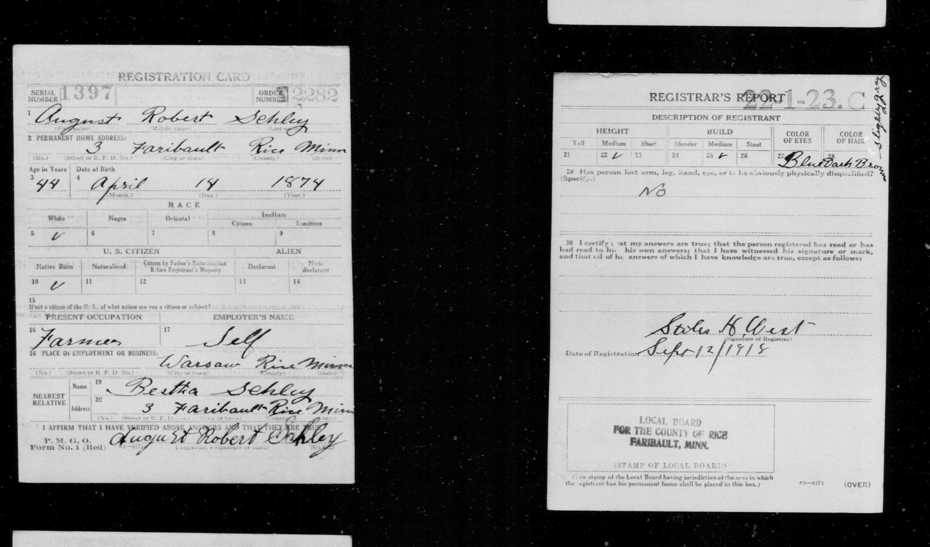 He registered for the Draft for World War I on 09/12/1918 in Faribault, Rice, Minnesota . [6] |