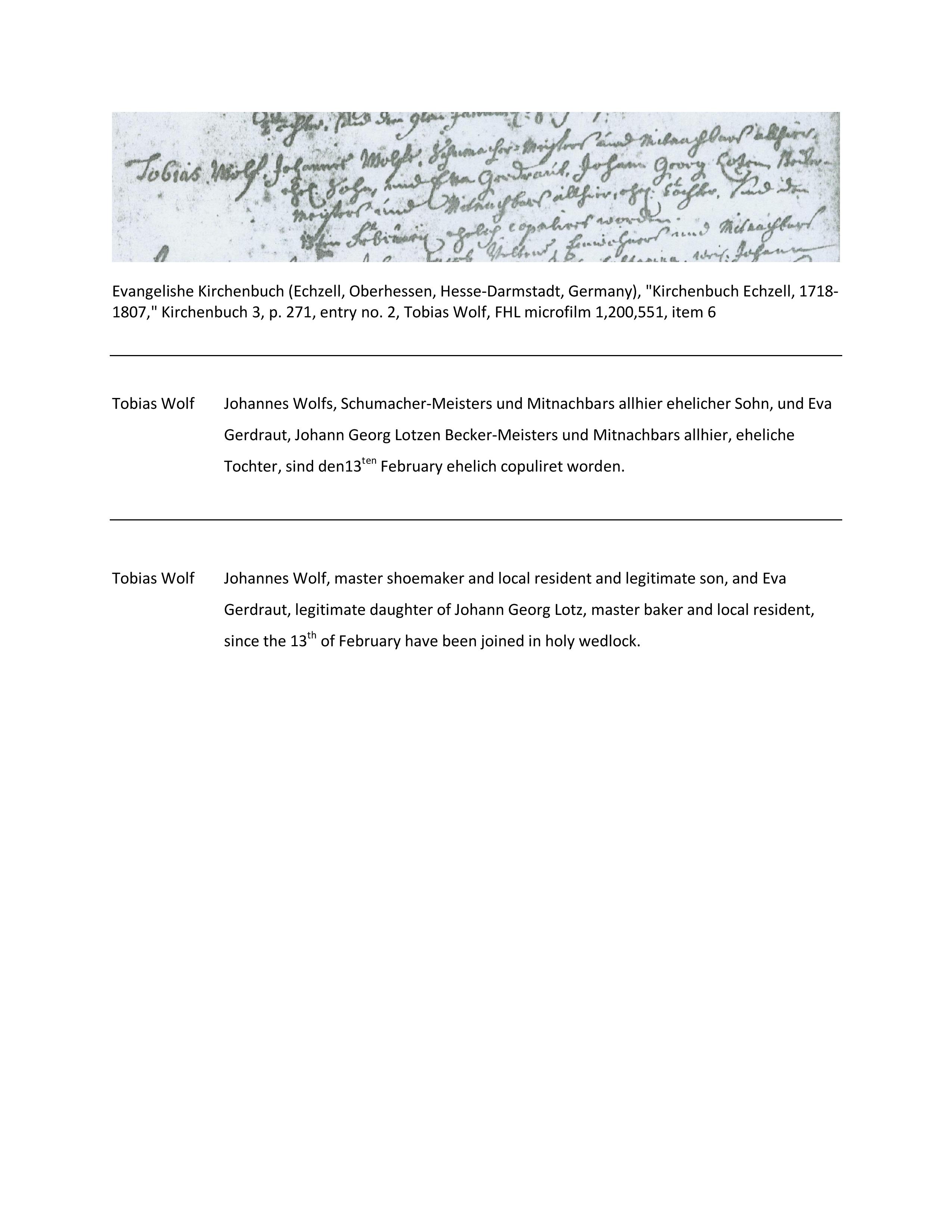 Evangelische Kirchenbuchen, Echzell, Oberhessen, Hesse-Darmstadt, Germany, Taufen-Tote-Hieraten-Konfirmationen, "Kirchenbuch Echzell, 1718-1807," Kirchenbuch 3, page 271, no. 2, Tobias Wolf; citing FHL microfilm 1,200,551, item 6 [Surety: 3]. |