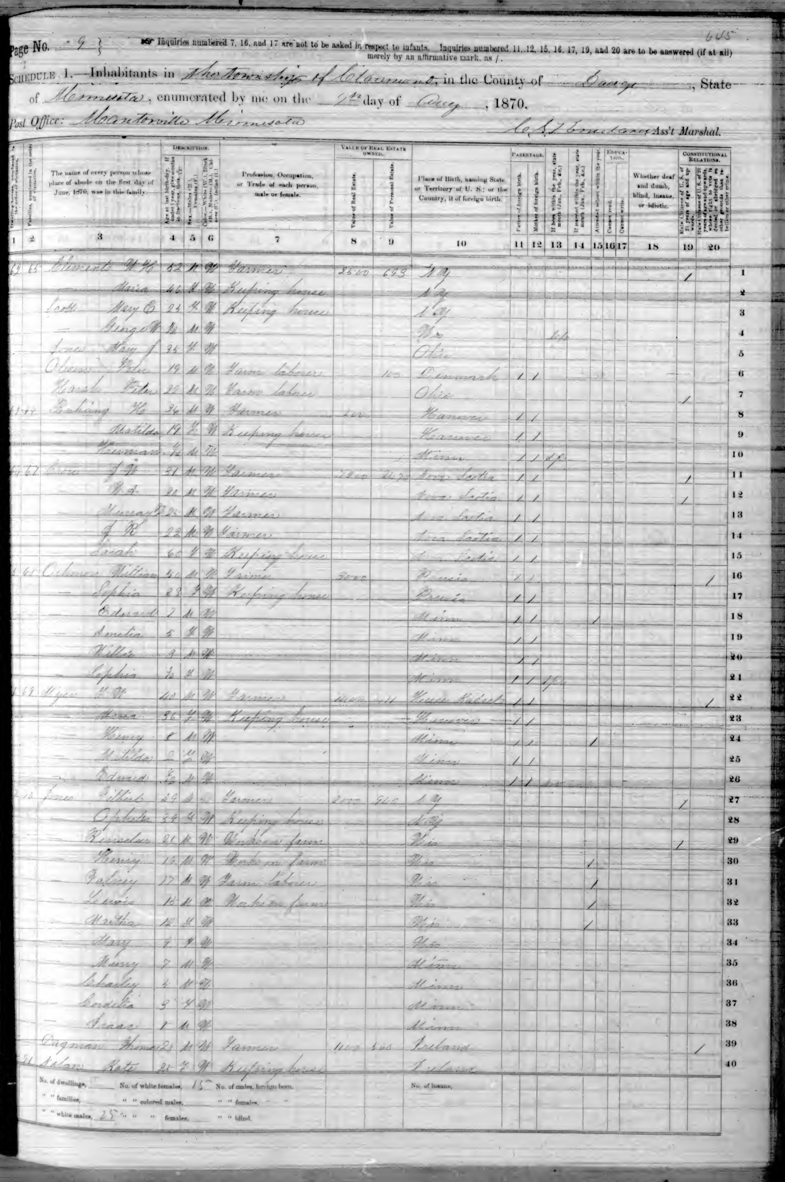 Ancestry.com Operations, Inc., 1870 United States Census, Claremont, Dodge, MN, page 9, dwelling 66, family 69, line 24, Myer, Henry; Database and images, Ancestry.com LLC, Ancestry.com : 2009 (http://www.Ancestry.com/ : accessed 11/16/2022); citing Ninth Census of the United States, 1870 U. S. Census, population schedules, National Archives and Records Administration Microfilm Publication M593 (1761 rolls), Records of the Bureau of the Census, Record Group 29, National Archives, Washington, DC, roll 3, image 56 [Surety: 3]. |