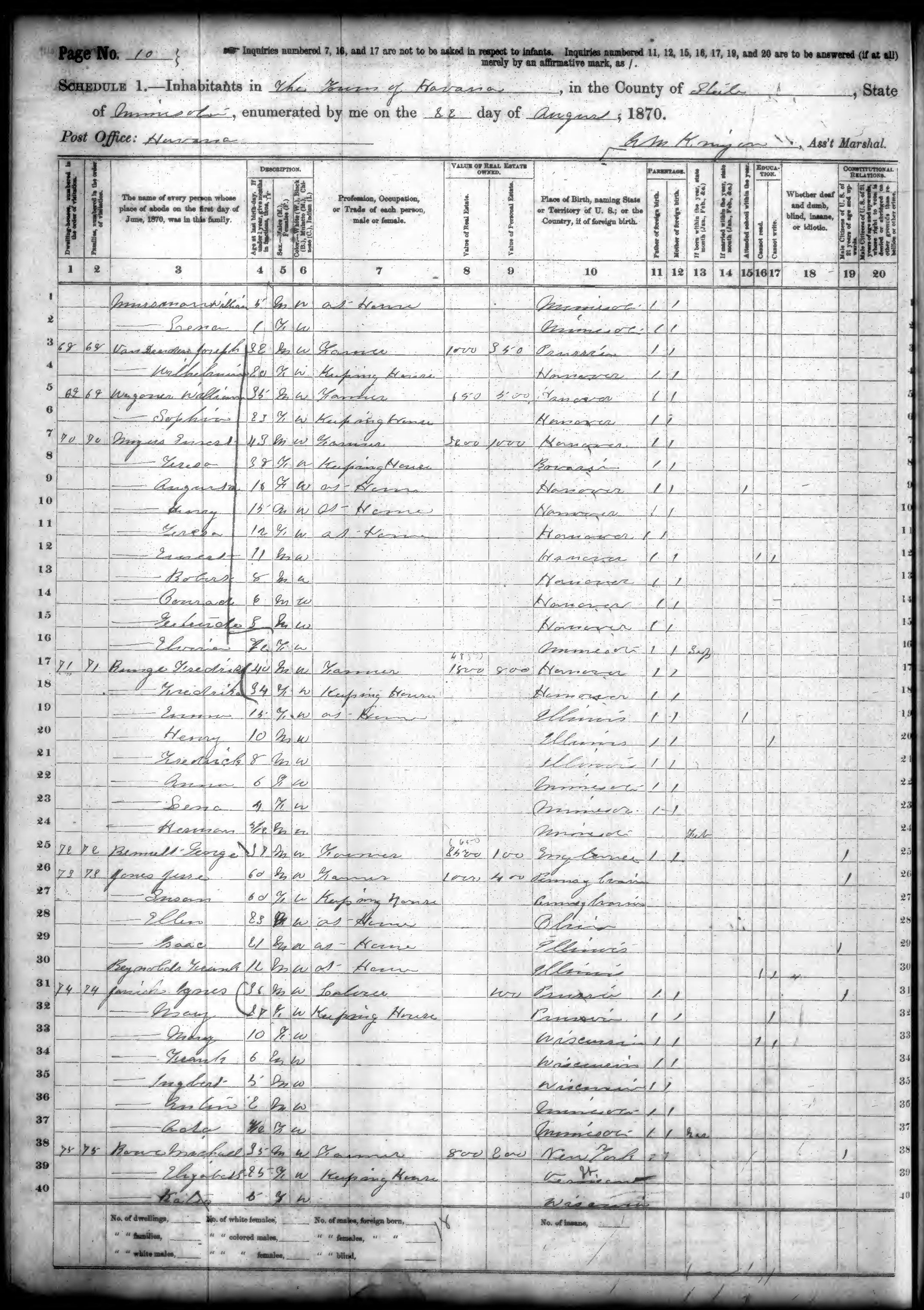 Ancestry.com Operations, Inc., 1870 United States Census, Havana, Steele, MN, page 10, dwelling 71, family 71, line 20, Runge, Henry; Database and images, Ancestry.com LLC, Ancestry.com : 2009 (http://www.Ancestry.com/ : accessed 04/26/2012); citing Ninth Census of the United States, 1870 U. S. Census, population schedules, National Archives and Records Administration Microfilm Publication M593 (1761 rolls), Records of the Bureau of the Census, Record Group 29, National Archives, Washington, DC, roll 716, image 454 [Surety: 3]. |