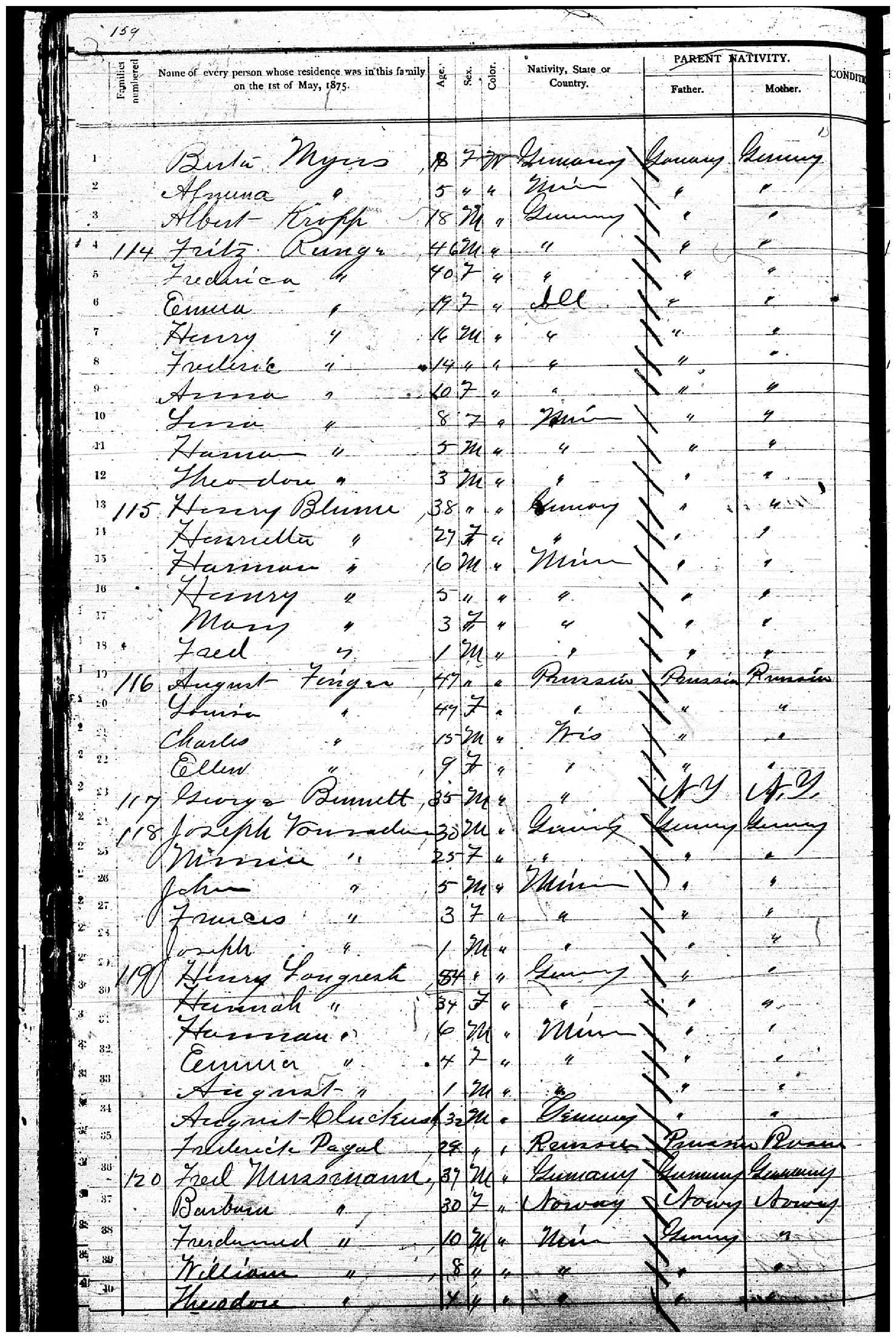 Ancestry.com Operations, Inc., Minnesota Territorial and State Censuses 1849-1905, 1875, Havana, Steele, MN, page 17, family 114, line 7, Henry Runge; Database and images, Ancestry.com LLC, Ancestry.com : 2007 (http://www.Ancestry.com/ : accessed 08/26/2012); citing Minnesota State Historical Society, St. Paul, Minnesota, Minnesota State Population Census Schedules, 1865-1905, microfilm MNSC_15 [Surety: 3]. |