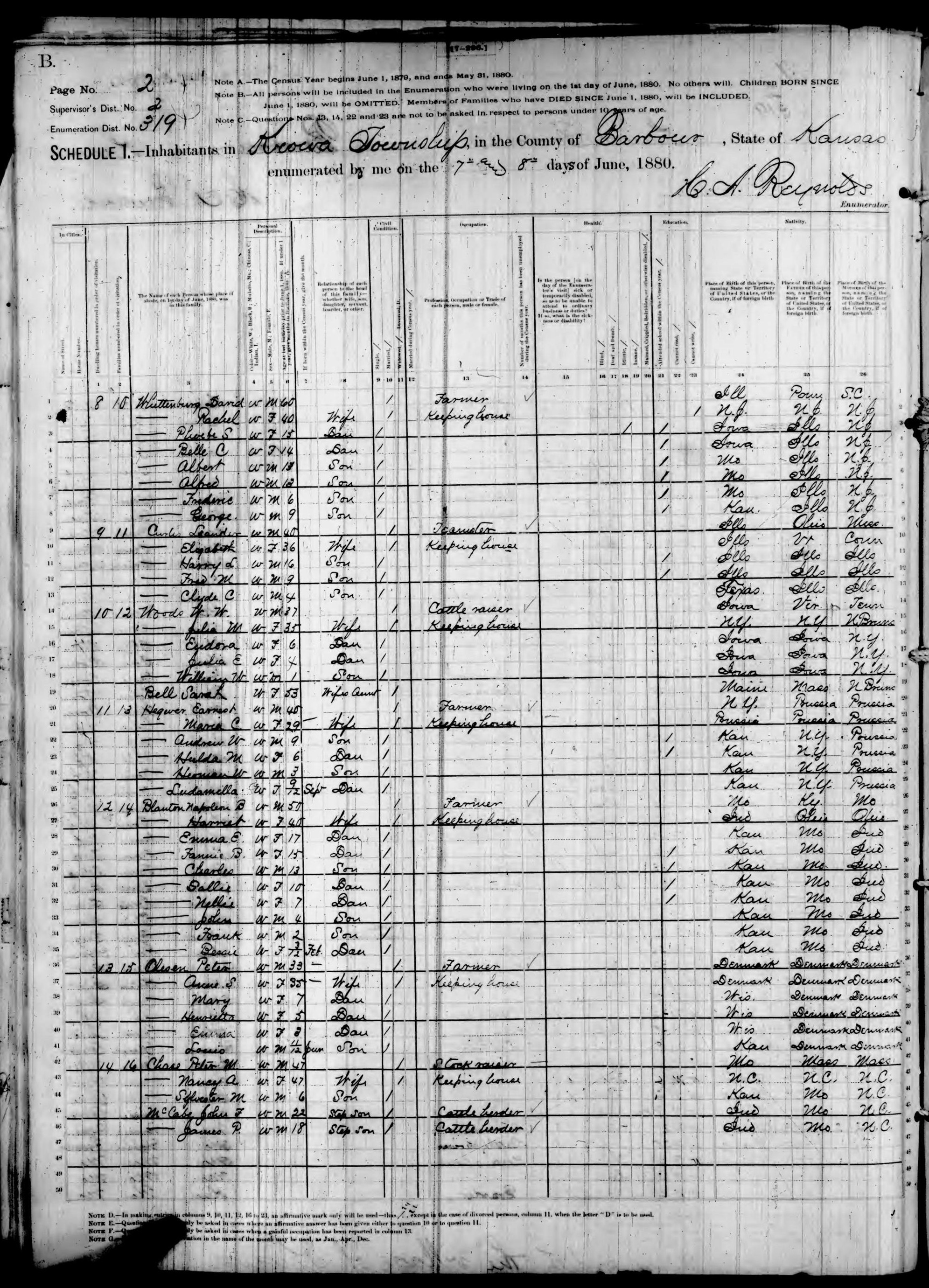 Ancestry.com Operations, Inc., 1880 United States Federal Census, ED 319, Kiowa, Barber, KS, page 2, dwelling 11, family 13, line 20, Hegwer, Earnest; Database and images, Ancestry.com LLC, Ancestry.com : 2010 (http://www.Ancestry.com/ : accessed 02/02/2016); citing Tenth Census of the United States, 1880 U. S. Census, population schedules, National Archives and Records Administration Microfilm Publication T9 (1454 rolls), Records of the Bureau of the Census, Record Group 29, National Archives, Washington, DC, roll 373, image 56 [Surety: 3]. |