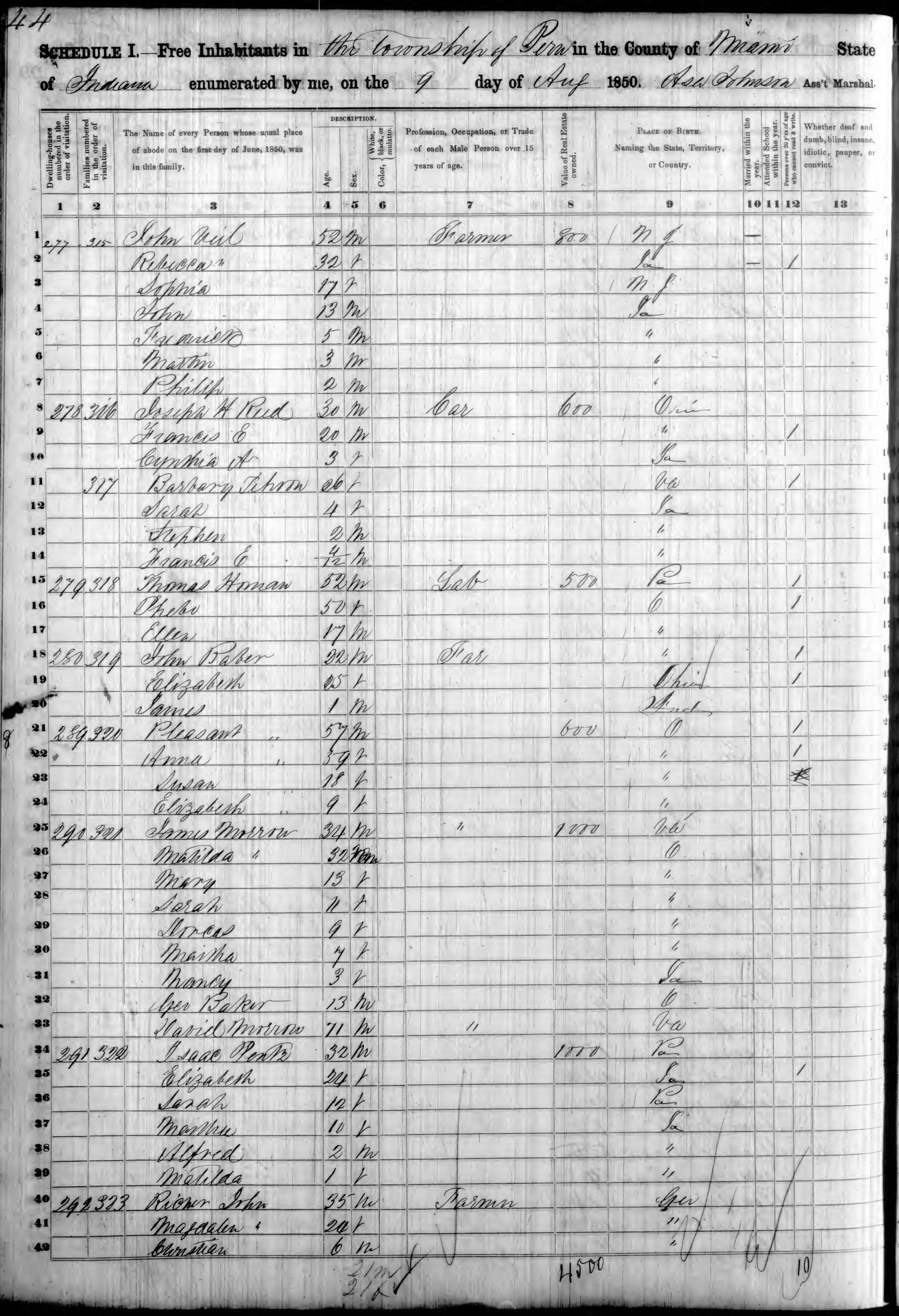 Ancestry.com Operations, Inc., 1850 United States Federal Census, Peru, Miami, IN, page 44, dwelling 291, family 322, line 38, Pentz, Alfred; Database and images, Ancestry.com LLC, Ancestry.com : 2009 (http://www.Ancestry.com/ : accessed 10/10/2019); citing Seventh Census of the United States, 1850 U. S. Census, population schedules, National Archives and Records Administration Microfilm Publication M432 (1009 rolls), Records of the Census Bureau, Record Group 29, National Archives, Washington, DC, roll 160, image 330 [Surety: 3]. |