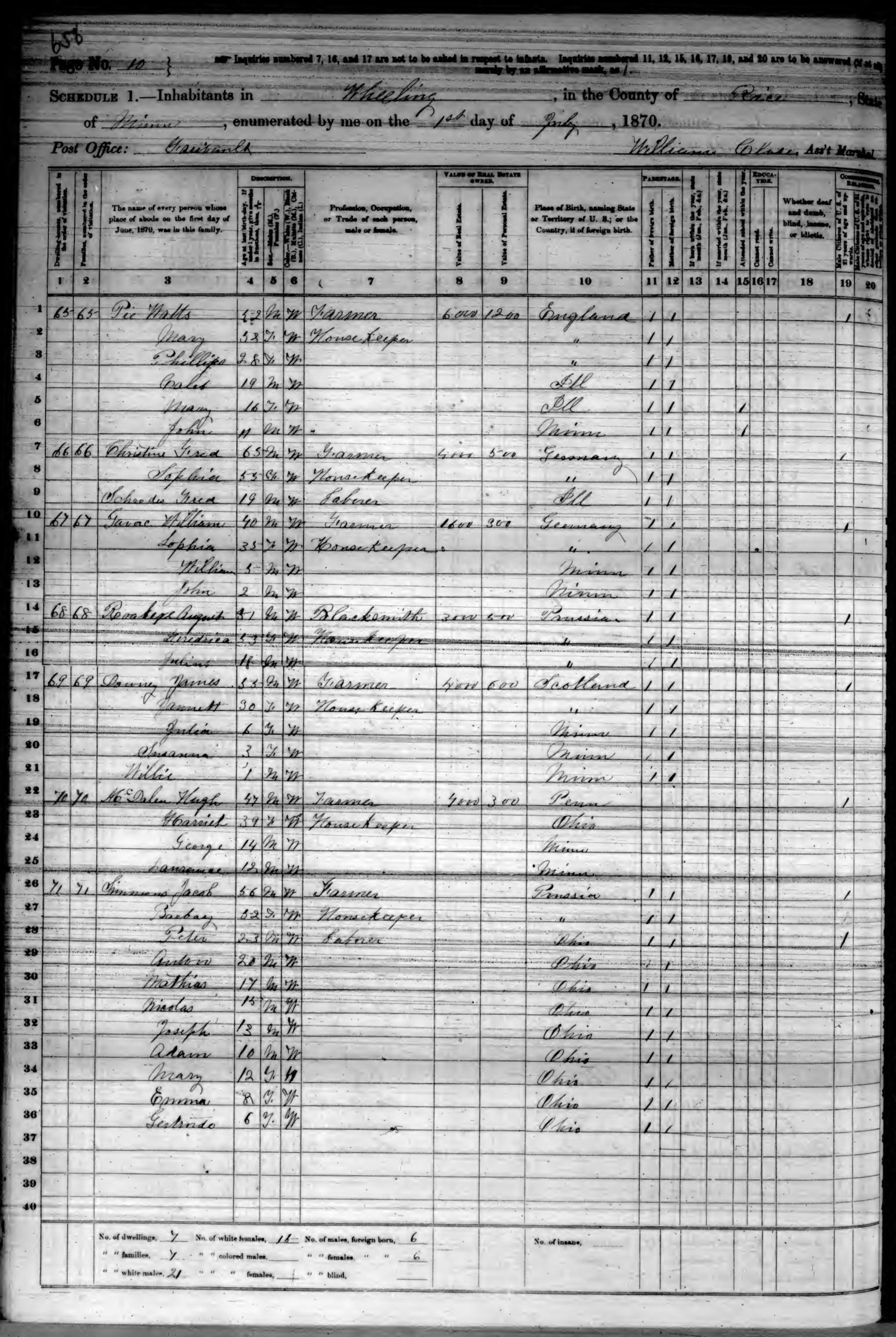 He appeared on the US Federal census on 06/01/1870 in Wheeling, Rice, Minnesota working for the Fred Christine family. [3] |