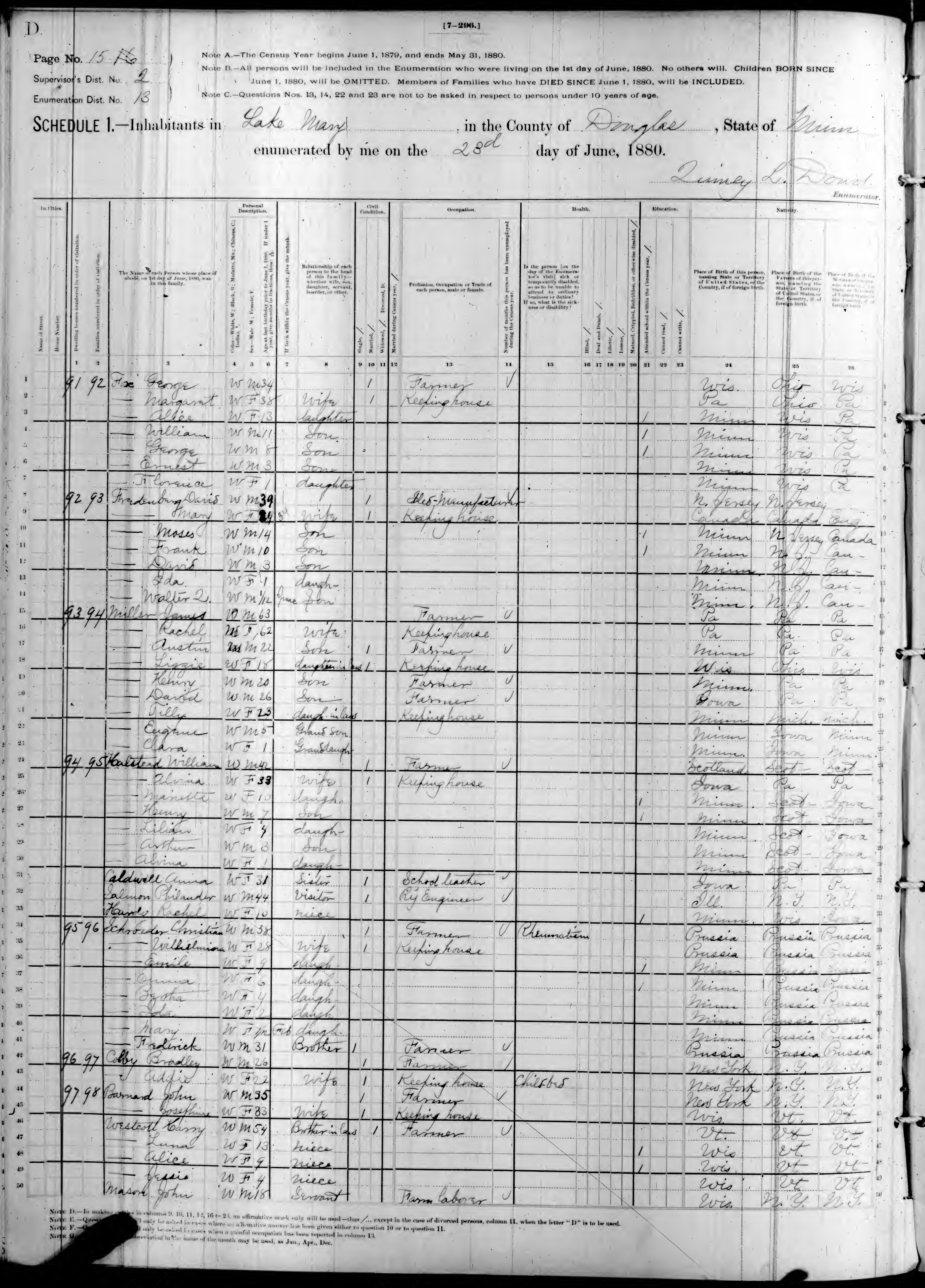Ancestry.com Operations, Inc., 1880 United States Federal Census, ED 13, Lake Mary, Douglas, MN, page 15, dwelling 95, family 96, line 41, Schroeder, Frederick; Database and images, Ancestry.com LLC, Ancestry.com : 2010 (http://www.Ancestry.com/ : accessed 10/17/2023); citing Tenth Census of the United States, 1880 U. S. Census, population schedules, National Archives and Records Administration Microfilm Publication T9 (1454 rolls), Records of the Bureau of the Census, Record Group 29, National Archives, Washington, DC, roll 618, image 648 [Surety: 3]. |