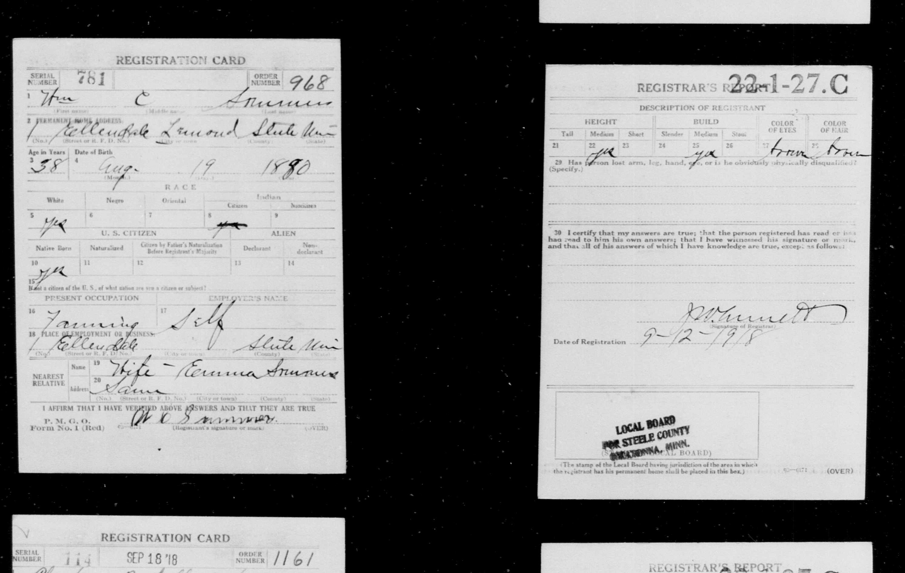 Ancestry.com Operations, Inc., 1920 United States Federal Census, ED 130, Lemond, Steele, MN, sheet 4A, dwelling 67, family 67, line 35, Sommers, William C; Database and images, Ancestry.com LLC, Ancestry.com : 2010 (http://www.ancestry.com/ : accessed 04/06/2011); citing Fourteenth Census of the United States, 1920 U. S. Census, population schedules, National Archives and Records Administration Microfilm Publication T625 (2076 rolls), Records of the Bureau of the Census, Record Group 29, National Archives, Washington, DC, roll 863, image 746 [Surety: 3]. |