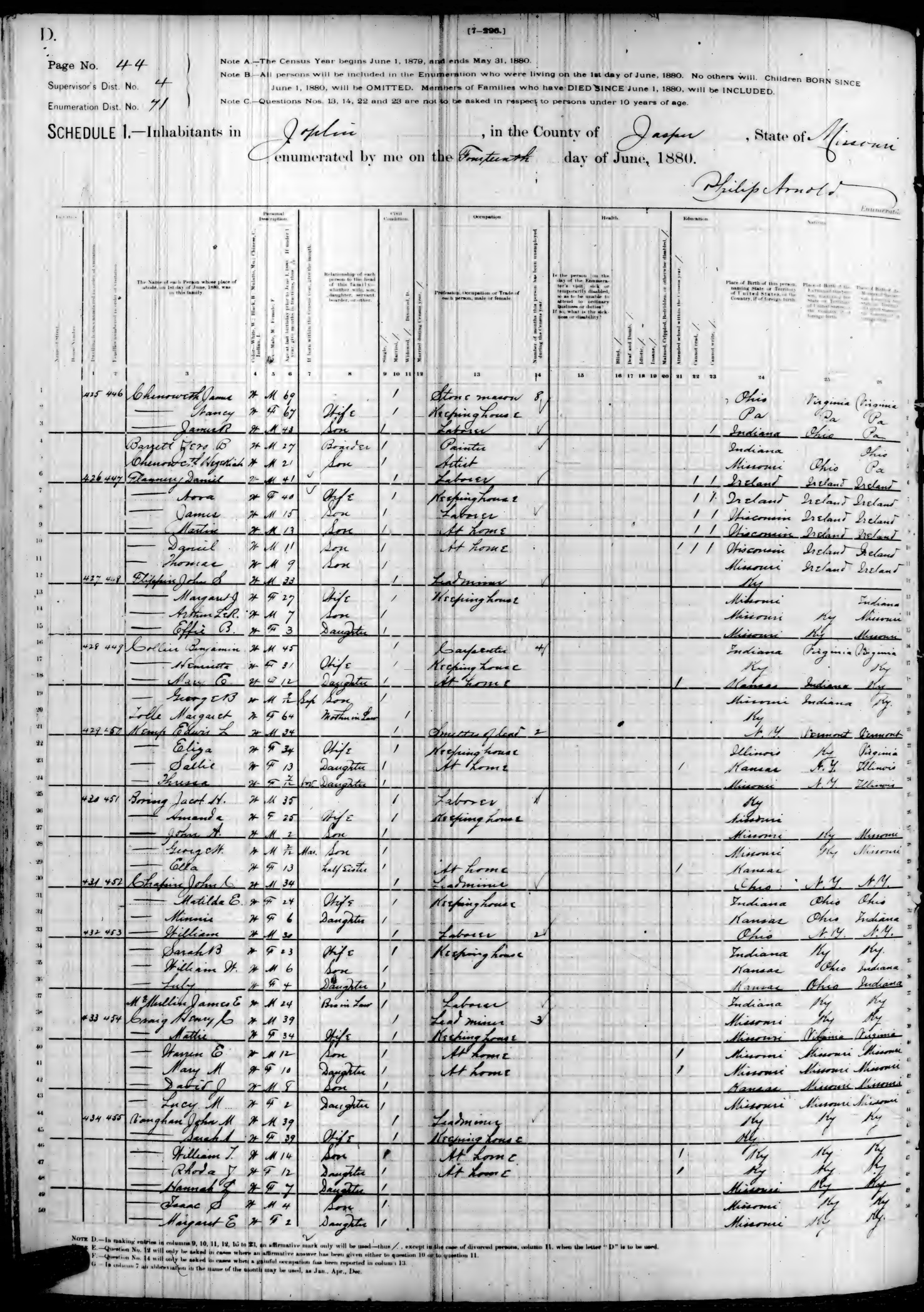 Ancestry.com Operations, Inc., 1880 United States Federal Census, ED 71, Joplin, Jasper, MO, page 44, dwelling 428, family 449, line 18, Collier, Mary E; Database and images, Ancestry.com LLC, Ancestry.com : 2010 (http://www.Ancestry.com/ : accessed 08/10/2025); citing Tenth Census of the United States, 1880 U. S. Census, population schedules, National Archives and Records Administration Microfilm Publication T9 (1454 rolls), Records of the Bureau of the Census, Record Group 29, National Archives, Washington, DC, roll 695, image 149 [Surety: 3]. |