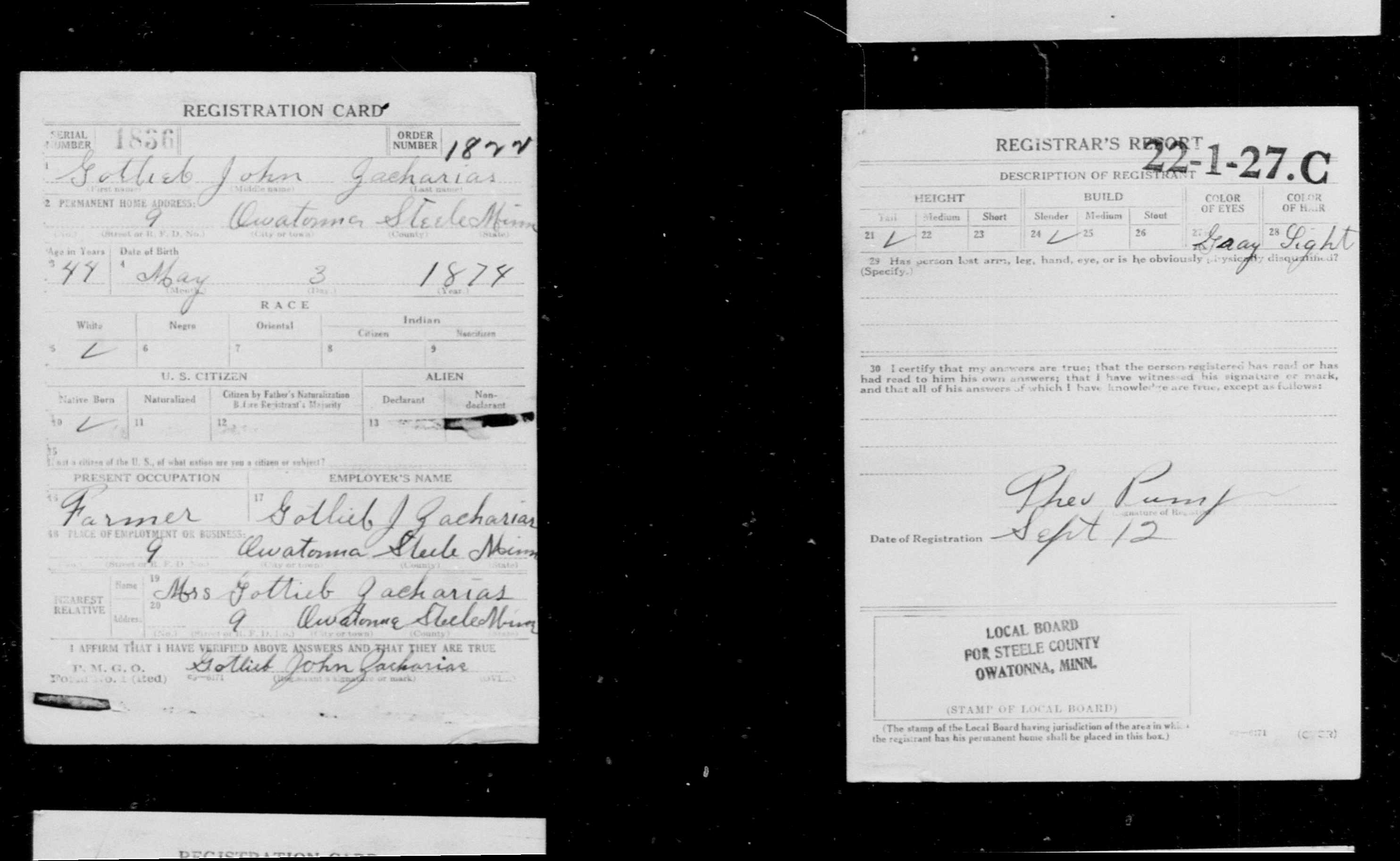 Ancestry.com Operations, Inc., U.S. World War I Draft Registration Cards, 1917-1918, Gotlieb John Zacharias; Database and images, Ancestry.com LLC, Ancestry.com : 2005 (http://www.Ancestry.com/ : accessed 08/16/2011); citing National Archives and Records Administration, United States Selective Service System, "World War I Selective Service System Draft Registration Cards, 1917-1918," Washington, DC, Series M1509, 4,582 rolls, FHL Microfilm 1,682,644 [Surety: 3]. |