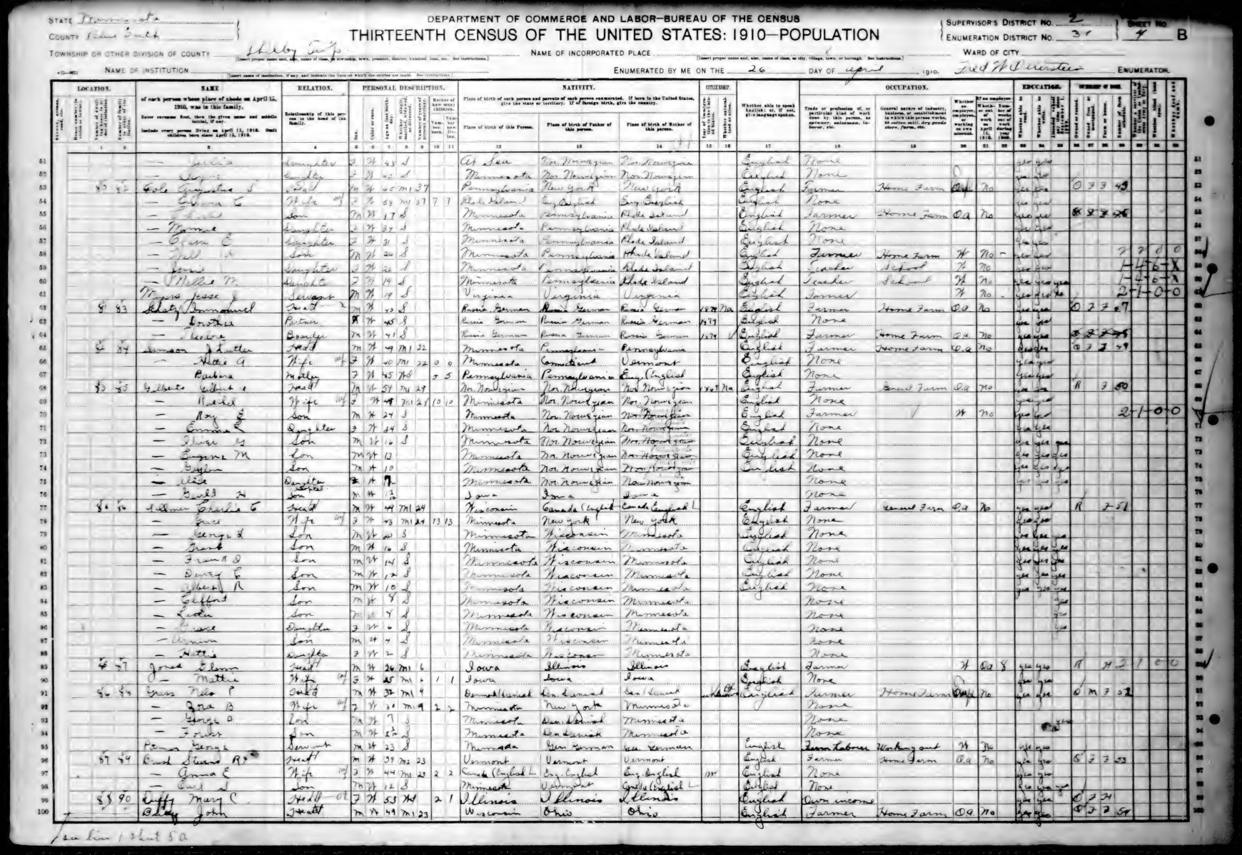 Ancestry.com Operations, Inc., 1910 United States Federal Census, ED 31, Shelby, Blue Earth, MN, sheet 4B, dwelling 86, family 88, line 91, Grass, Nelo P; Database and images, Ancestry.com LLC, Ancestry.com : 2006 (http://www.ancestry.com/ : accessed 09/16/2011); citing Thirteenth Census of the United States, 1910 U. S. Census, population schedules, National Archives and Records Administration Microfilm Publication T624 (1178 rolls), Records of the Bureau of the Census, Record Group 29, National Archives, Washington, DC, roll 691, image 502 [Surety: 3]. |