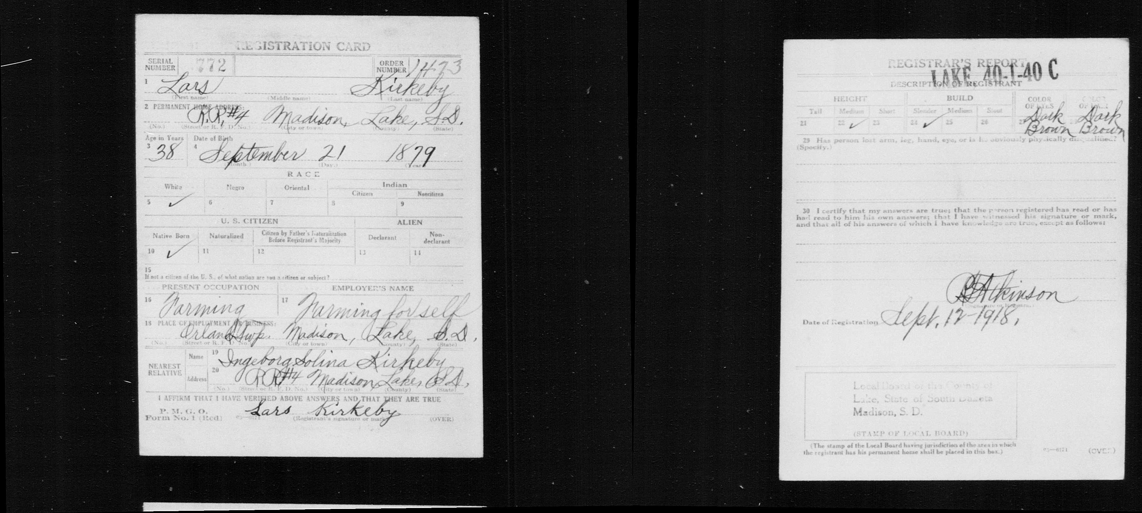 He was described as of medium height and build with dark brown eyes and hair on 09/12/1918 in Madison, Lake, South Dakota . [4] |