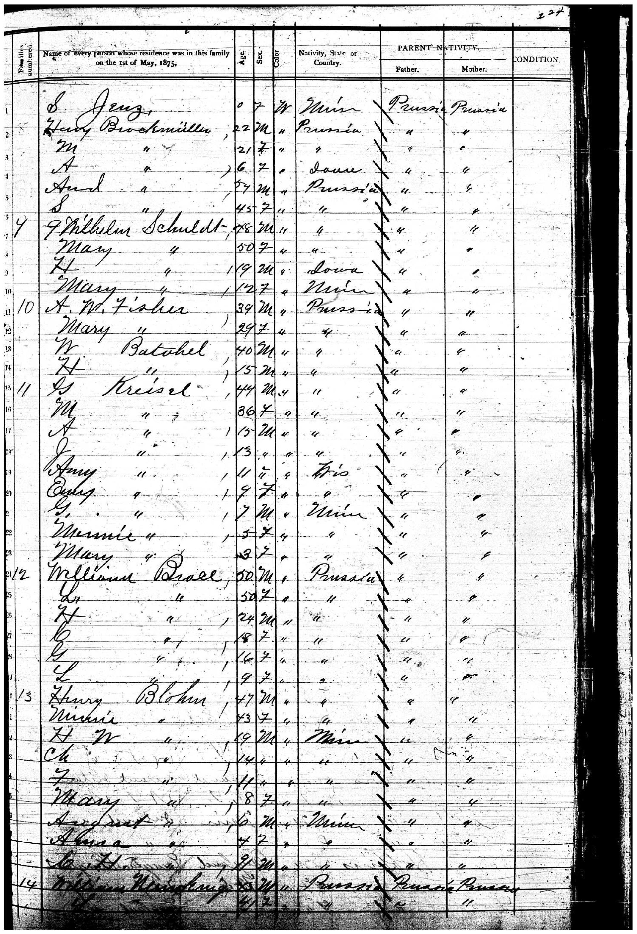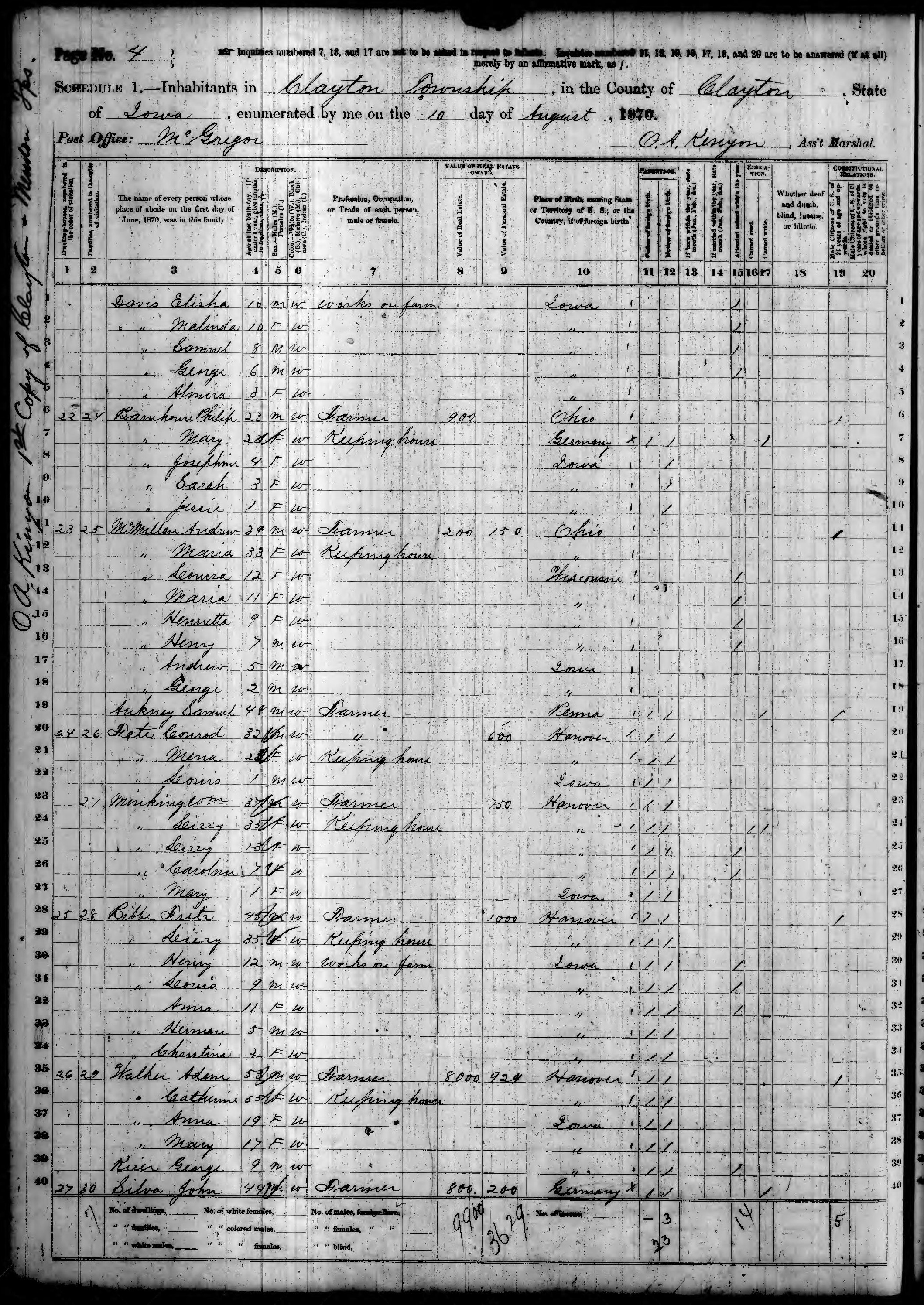 Ancestry.com Operations, Inc., 1870 United States Census, Clayton, Clayton, IA, page 4, dwelling 24, family 27, line 23, Minking, Wm; Database and images, Ancestry.com LLC, Ancestry.com : 2009 (http://www.Ancestry.com/ : accessed 10/25/2015); citing Ninth Census of the United States, 1870 U. S. Census, population schedules, National Archives and Records Administration Microfilm Publication M593 (1761 rolls), Records of the Bureau of the Census, Record Group 29, National Archives, Washington, DC, roll 383, image 92 [Surety: 3]. |