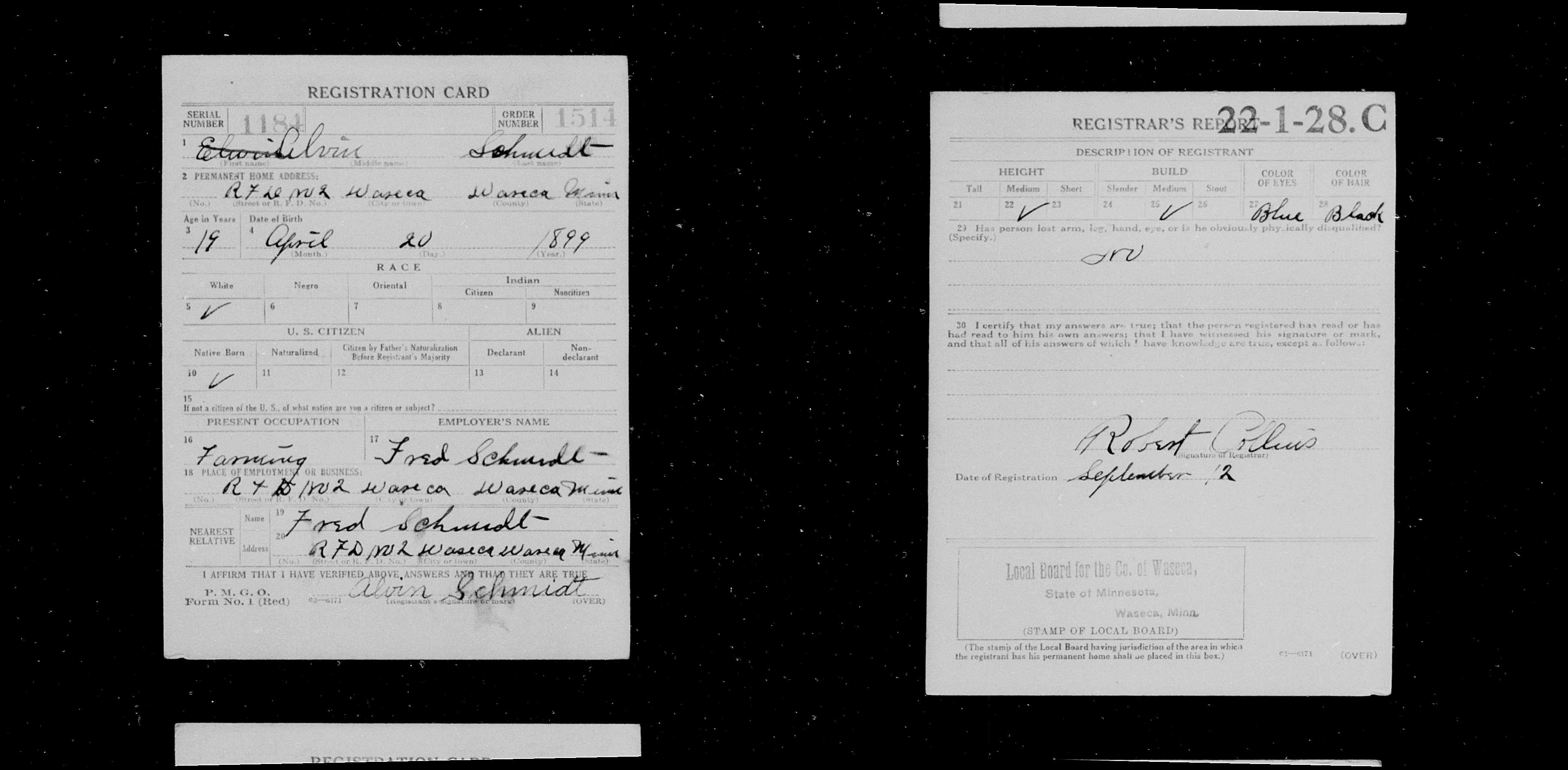 Ancestry.com Operations, Inc., U.S. World War I Draft Registration Cards, 1917-1918, Alvin Schmidt; Database and images, Ancestry.com LLC, Ancestry.com : 2005 (http://www.Ancestry.com/ : accessed 10/11/2011); citing National Archives and Records Administration, United States Selective Service System, "World War I Selective Service System Draft Registration Cards, 1917-1918," Washington, DC, Series M1509, 4,582 rolls, FHL Microfilm 1,682,693 [Surety: 3]. |