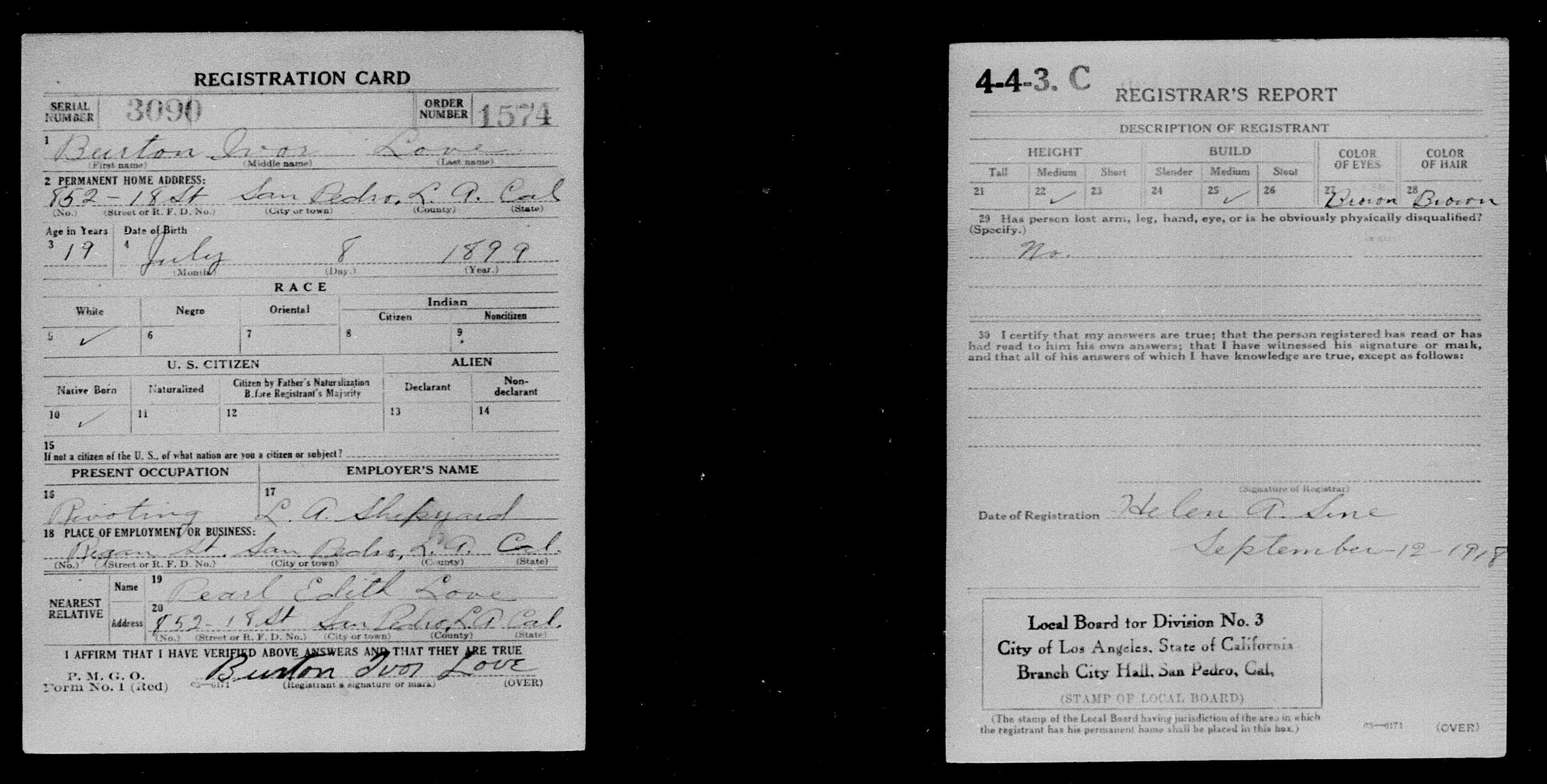 Ancestry.com Operations, Inc., U.S. World War I Draft Registration Cards, 1917-1918, Burton Ivor Love; Database and images, Ancestry.com LLC, Ancestry.com : 2005 (http://www.Ancestry.com/ : accessed 06/07/2012); citing National Archives and Records Administration, United States Selective Service System, "World War I Selective Service System Draft Registration Cards, 1917-1918," Washington, DC, Series M1509, 4,582 rolls, FHL Microfilm 1,530,800 [Surety: 3]. |