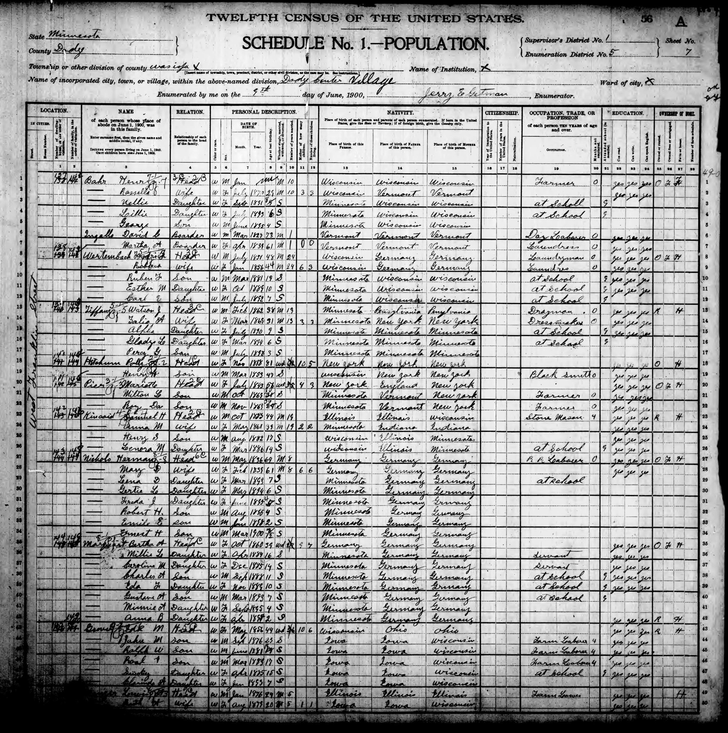 Ancestry.com Operations, Inc., 1900 United States Federal Census, ED 5, Dodge Center Village, Dodge, MN, sheet 7A, dwelling 144, family 148, line 37, Marquart, Caroline M; Database and images, Ancestry.com LLC, Ancestry.com : 2010 (http://www.Ancestry.com/ : accessed 12/12/2010); citing Twelth Census of the United States, 1900 U. S. Census, population schedules, National Archives and Records Administration Microfilm Publication T623 (1854 rolls), Records of the Bureau of the Census, Record Group 29, National Archives, Washington, DC, roll 762, image 114 [Surety: 3]. |