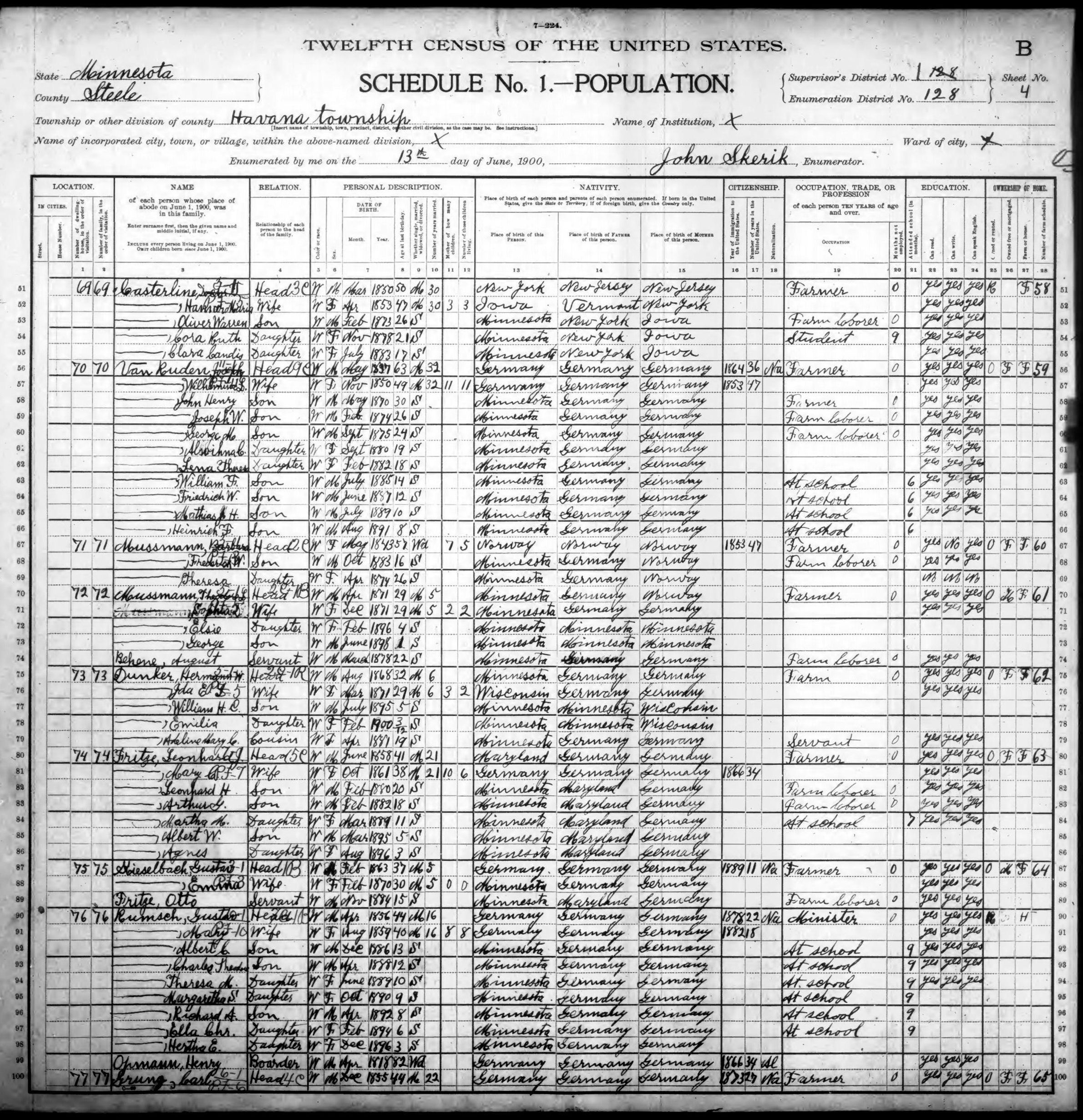 Ancestry.com Operations, Inc., 1900 United States Federal Census, ED 128, Havana, Steele, MN, sheet 4B, dwelling 75, family 75, line 89, Fritze, Otto; Database and images, Ancestry.com LLC, Ancestry.com : 2010 (http://www.Ancestry.com/ : accessed 12/05/2010); citing Twelth Census of the United States, 1900 U. S. Census, population schedules, National Archives and Records Administration Microfilm Publication T623 (1854 rolls), Records of the Bureau of the Census, Record Group 29, National Archives, Washington, DC, roll 793, image 121 [Surety: 3]. |