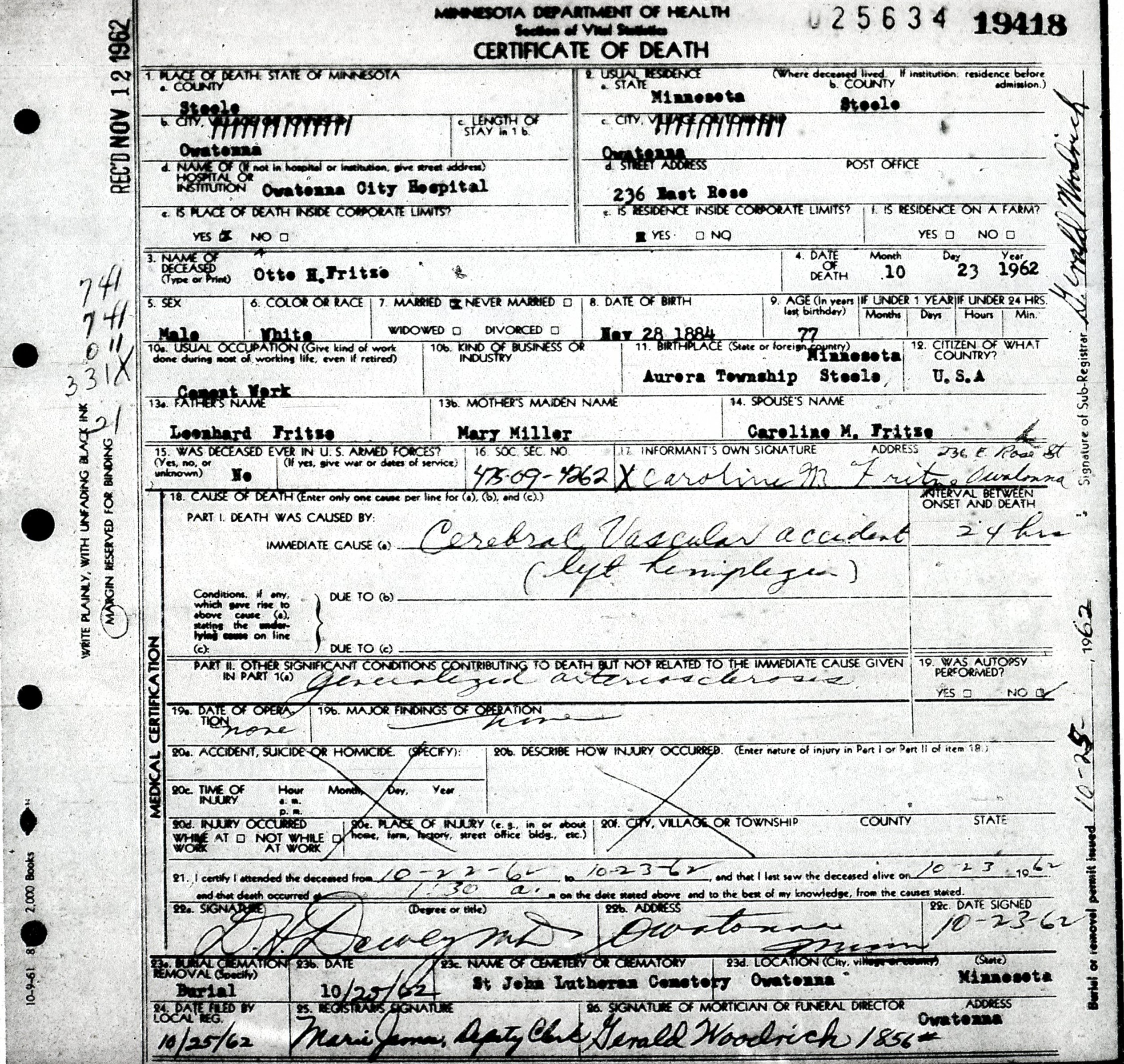 Minnesota, Death Certificate, death certificate no. 19418 (10/23/1962), Otto H Fritze [Surety: 3]. |