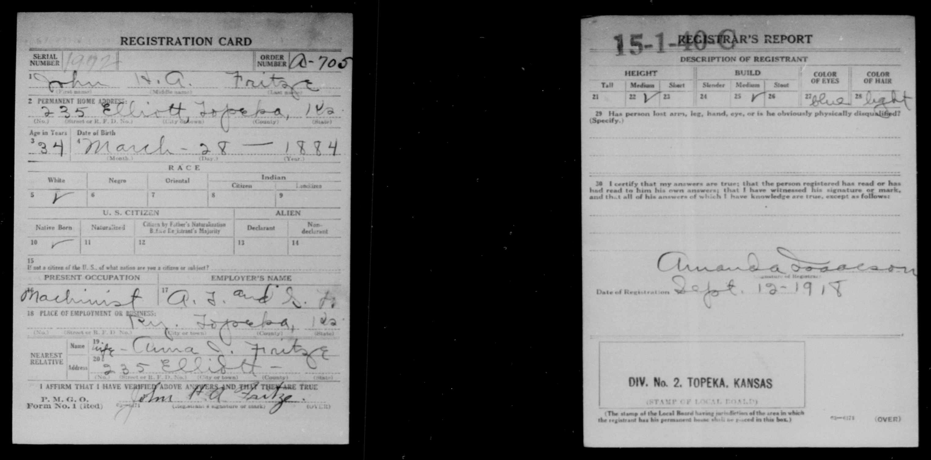 He registered for the Draft for World War I on 09/12/1918 in Topeka, Shawnee, Kansas . [9] |